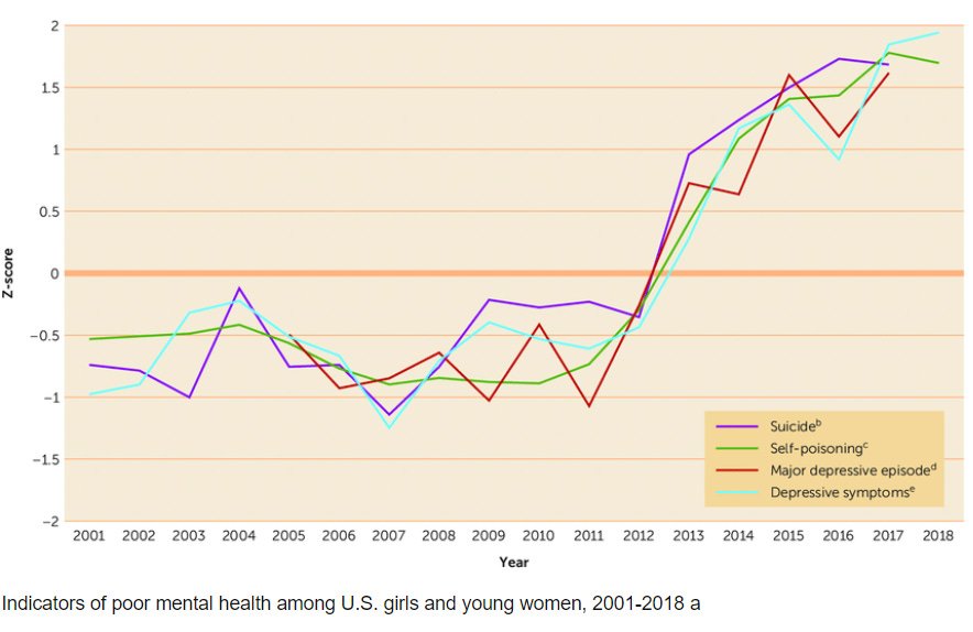 En el caso de esa reflexión de Noah Smith, la idea sigue la misma línea, pero asociándola a esas cifras que cada vez más estudios arrojan sobre la infelicidad de los jóvenes. Estamos mejor que nunca en muchas cosas, pero los chicos y sobre todo las chicas parecen estar especialmente tristonas y desmotivadas. Hay un gráfico aterrador: