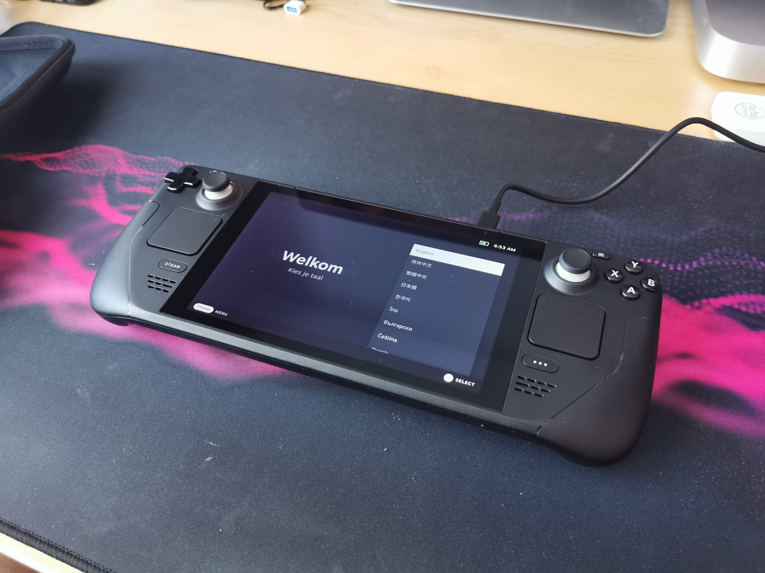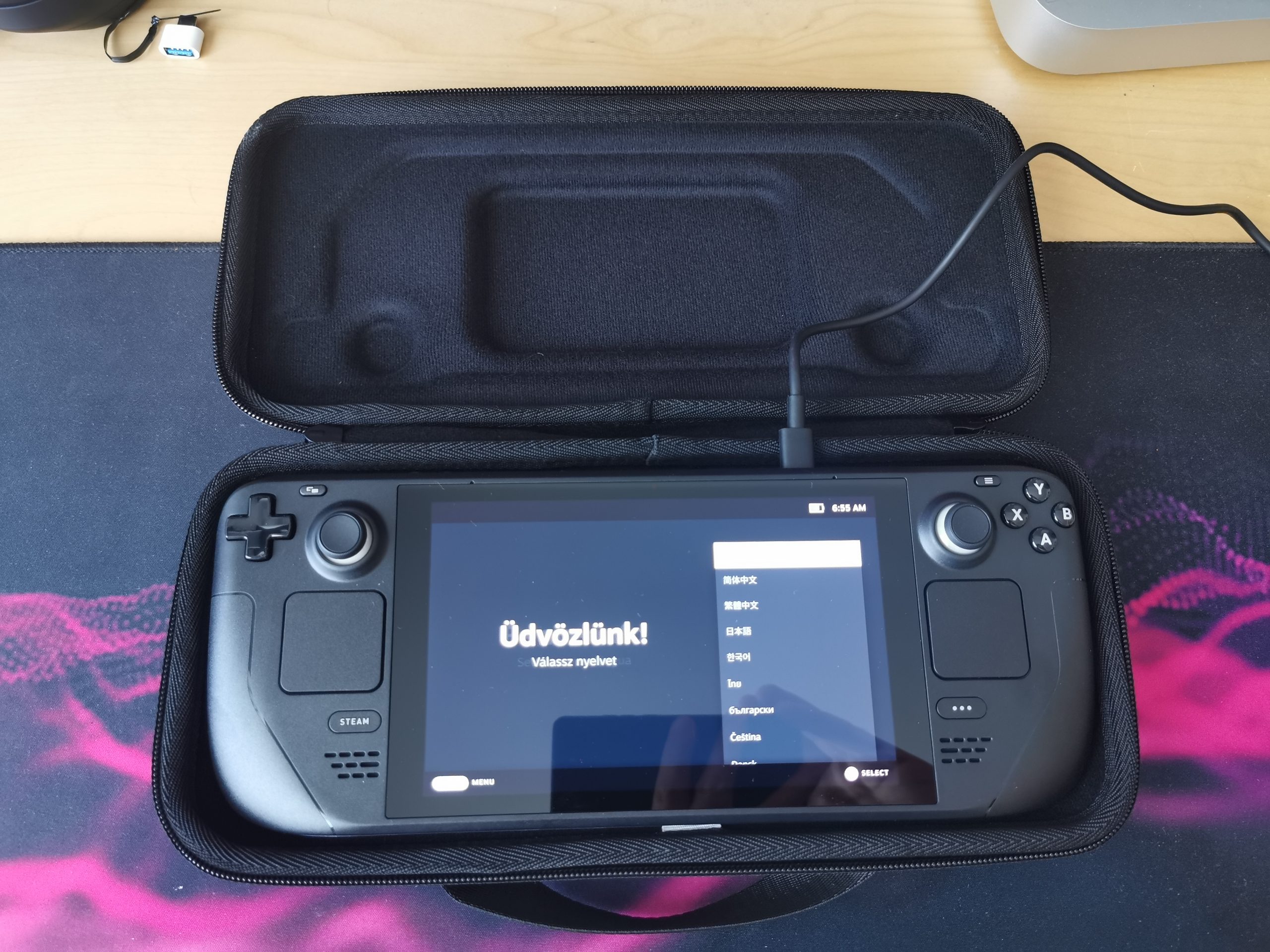 La puesta en marcha es bastante rápida y sencilla (hay alguna actualización de por medio). Cuando por fin me pidió la contraseña de Steam tuve un pequeño problema: como en mi caso es muy fuerte, larga y con bastantes caracteres especiales, tardé un par de minutos en lograr meterla bien y comprobar que había tecleado todos los caracteres correctamente en la pantallita. Por supuesto, todo el proceso con mis recién estrenadas gafas de presbicia: sin ellas lo hubiera tenido más crudo, qué condena, meu deu.