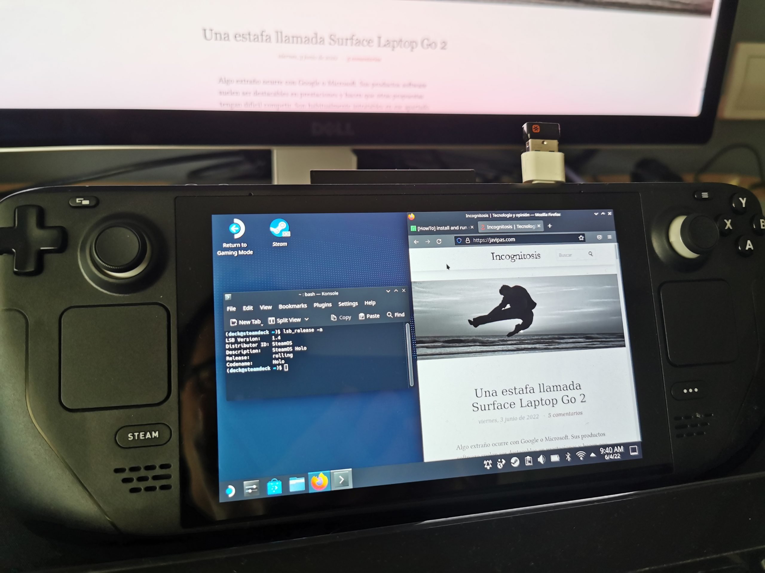 Luego probé otras cosas, como el modo escritorio, por supuesto. Tenía mucha curiosidad por este modo, pero haré más pruebas cuando me llegue un hub USB que he pedido y que me permitirá conectarla más fácilmente al monitor, teclado y ratón. De momento solo conecté mi receptor Logitech Unifying mediante un adaptador USB-A a USB-C y la cosa pirulaba sin problemas. La distribución Linux Steam OS está derivada de Arch Linux —una distro que yo no he usado demasiado— y va como una seda: solo pude hacer unas pequeñas pruebas, pero esto tiene pinta de poder comportarse como un PC de sobremesa muy, muy notable.