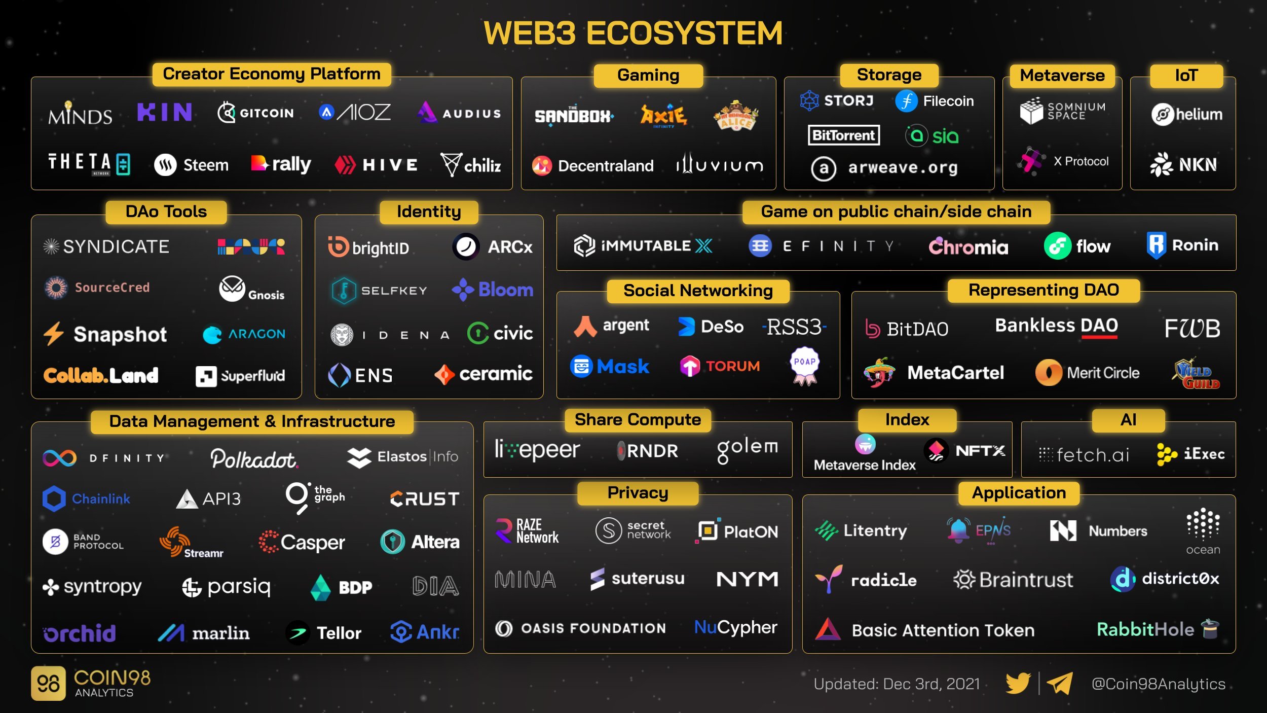 La idea es curiosa, quizás algo buenista, y ahí es donde Jack Dorsey ataca a la idea y a la ilusión de que la Web3 será propiedad de todos. Según él seguirá pasando lo mismo que pasa con la Web2, aunque en lugar de ser borreguitos de los Facebook o Google del mundo lo seremos de las empresas de Capital Riesgo, que son las que invierten en todas esas nuevas startups que precisamente se han apuntado al carro Web3. Hay unas cuantas aquí vía Coin98Analytics, que en su cuenta de Twitter tiene muchas imágenes de este palo con cien mil proyectos que están distribuidos en distintos ecosistemas, cada uno asociado normalmente a una cadena de bloques/criptomonedas: