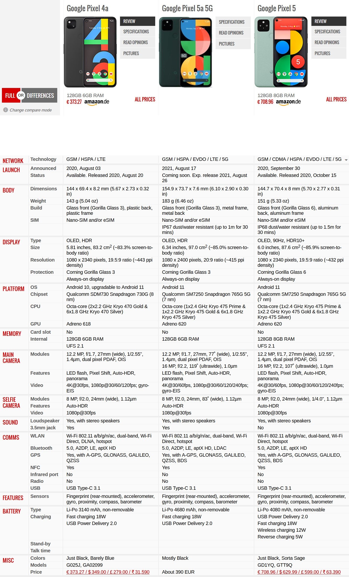 Y lo tercero y más importante, por el dispositivo en sí. Es imposible no ver el Pixel 5a como un refrito tardío. Uno que es una extraña mezcla entre el Pixel 4a y el Pixel 5 del año pasado. La tabla de GSMArena comparando los tres igual os aclara algo.