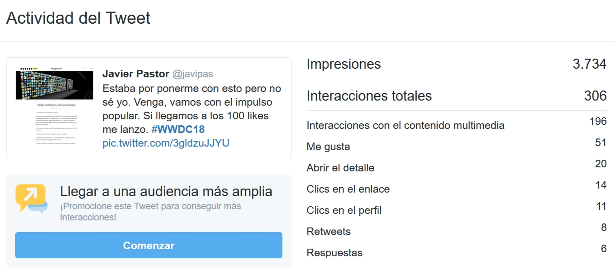 En esas 40 horas aprox, esas son las estadísticas. El tuit lo vieron casi 4.000 personas. Unas 200 clicaron en la imagen —algo que permitía ver ese adelanto de la historia—, pero al final solo 51 le dieron a me gusta. O yo hice mal la estrategia y no aclaré de qué iba el tema, o simplemente el formato no interesa demasiado.
