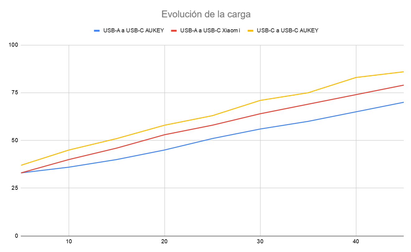 | Minutos | USB-A a USB-C AUKEY | USB-A a USB-C Xiaomi | USB-C a USB-C AUKEY |