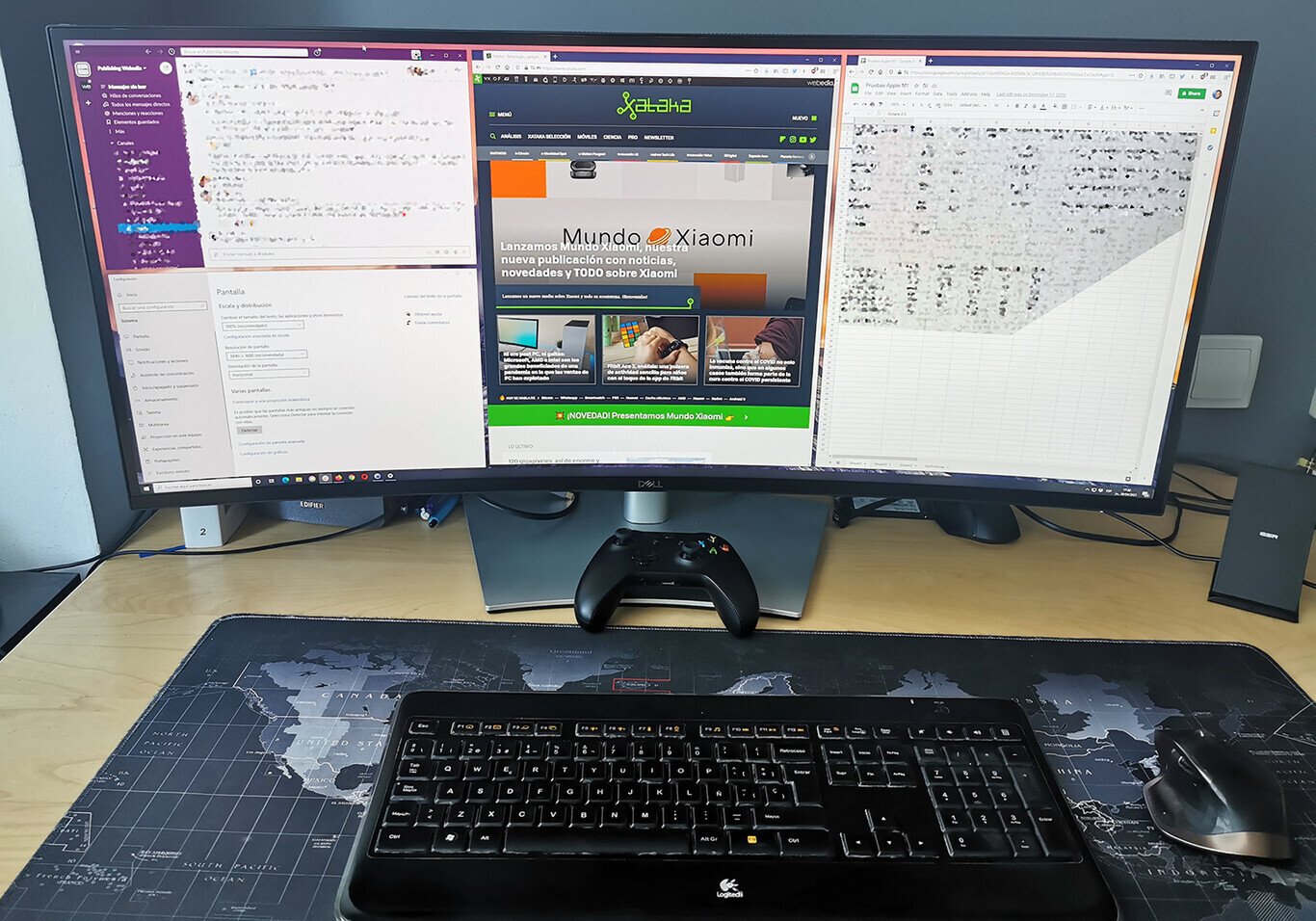 Como veis, el Dell parece más manejable, y ciertamente lo es, pero me he dado cuenta de una cosa: que yo no necesito un ultrapanorámico. Esa tercera ventana a la izquierda (que normalmente era Slack en mi caso) era bastante supérflua, y de hecho me distraía de mi "flow". Ya sabéis cómo soy: me pongo a teclear y la prosa tecnológica sale como si me poseyera Asimov, es la pera.