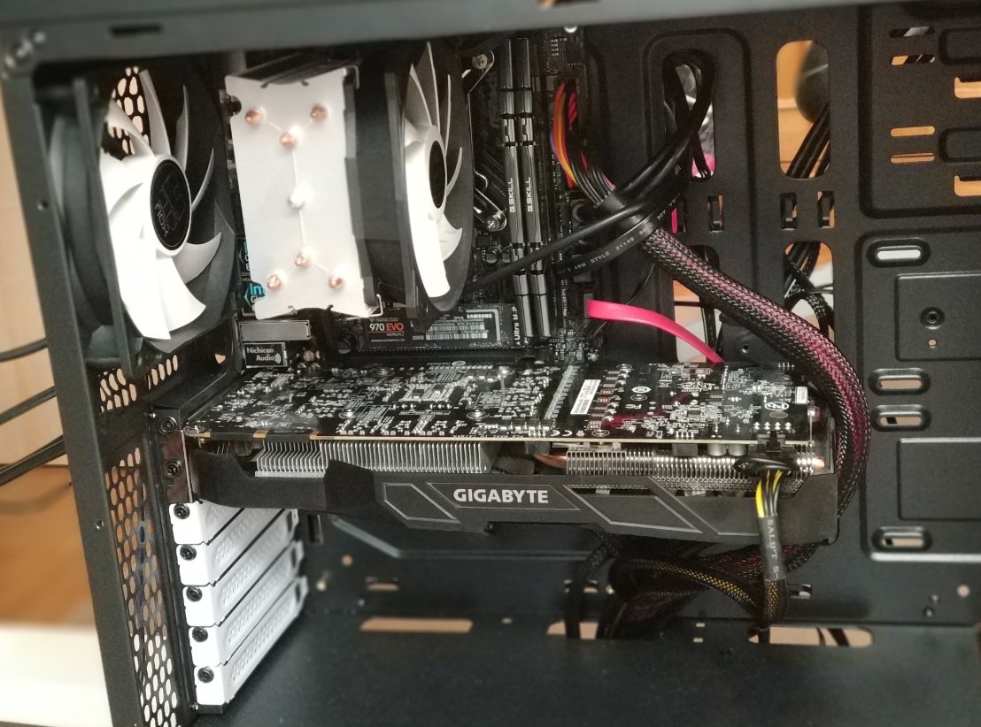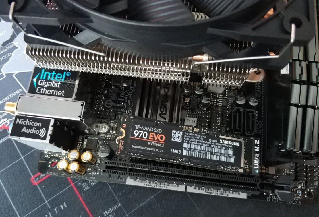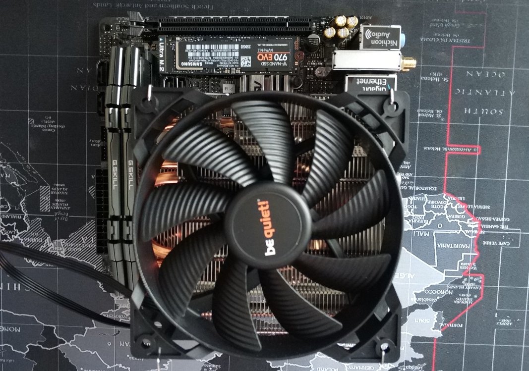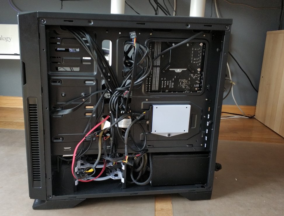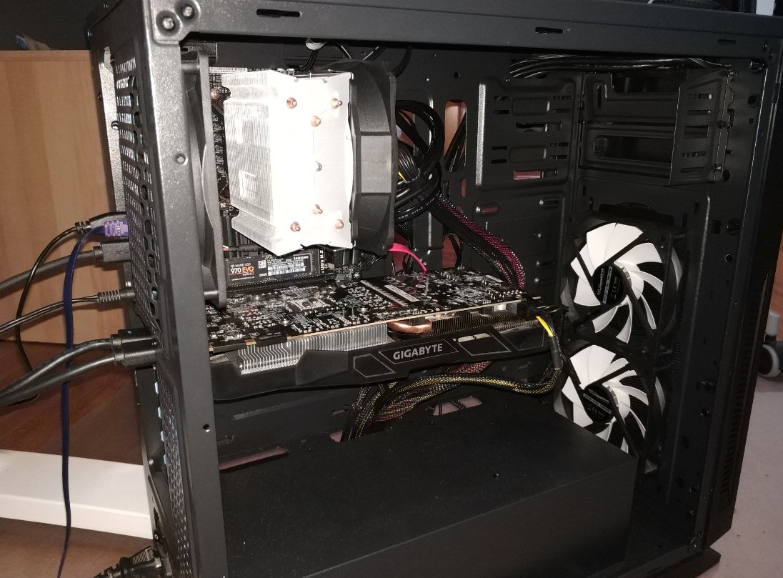 Los componentes llegaron sanos y salvo a lo largo de la siguiente semana, y cuando por fin tuve tiempo el fin de semana me puse manos a la obra para montarlo todo. Estamos en 2018, hacía básicamente ocho años que no montaba un PC —hubo una excepción— y la verdad, nada ha cambiado. Montar el ventilador del procesador es de largo lo más rollo, y a partir de ahí todo es básicamente enchufar y listo. Me sorprendió el tamaño de la unidad SSD M.2 —cuánta tecnología en algo tan pequeño, qué maravilla— y como veis por las fotos, ese ventilador horizontal de be quiet acabó teniendo que ser devuelto para sustituirlo por el de Nox.