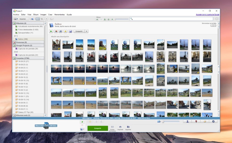 Me encontré con una grata sorpresa aquí de aquellos tiempos en los que usaba Picasa: las fotos que en la anterior hornada estaban marcadas como favoritas o etiquetadas de algún modo (como los saltos, algunos de los cuales tenía etiquetados) seguían etiquetados al volver a instalar Picasa e importarlas. Es como si al tocar cualquier imagen con Picasa la aplicación metiese unos preciosos bits de información para guardar esos metadatos. Bien por Picasa, sí señor.