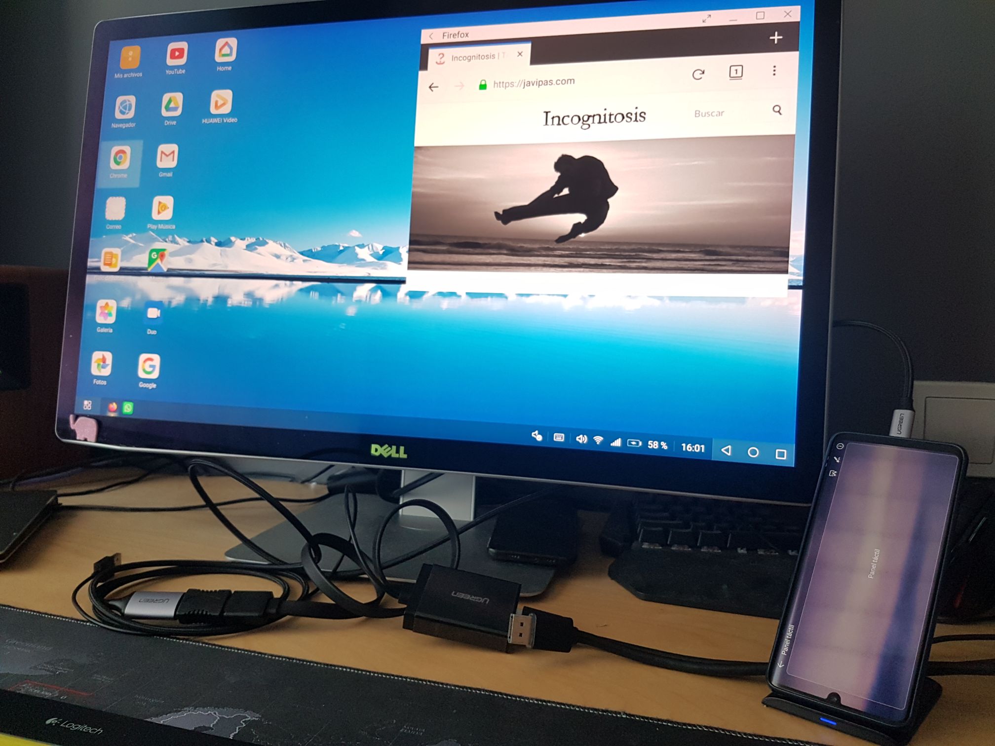 Así que aquí estamos, con el P30 Pro conectado al monitor con el cable y el adaptador, y el ratón y el teclado conectados vía Bluetooth. El escritorio no queda muy bonito: los cables hacen que esté todo un poco cutre, pero lo cierto es que funciona. La pregunta, claro es qué tal lo hace. ¿Cómo se comporta el P30 Pro si quieres usarlo como PC de escritorio?