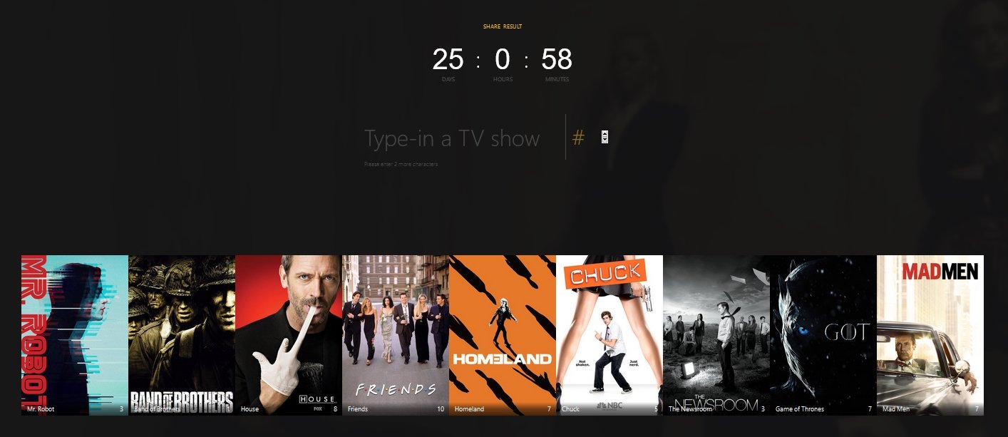 El chaval aquí daba un enlace curioso: en la web tiii.me puedes ir metiendo nombres de series, establecer las temporadas que has visto de esas series, y el servicio te calcula el tiempo invertido en ir viéndolas. Yo empecé a hacer la prueba con algunas que he ido viendo a lo largo del tiempo, y con apenas una decena ya llevaba consumidos 25 días de mi vida. 25 días que no he hecho más que estar tirado en una cama o en un sofá perdiendo el tiempo, según ese argumento.