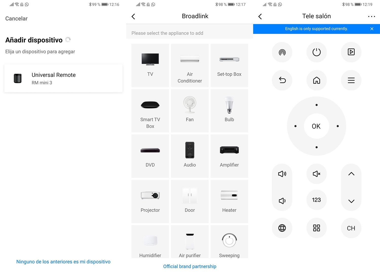 No llevo ni 10 minutos usándolo, ojo, pero ya lo tengo claro como el agua. El pequeño cilindrín se conecta por ejemplo a un puerto USB de la tele para alimentarse. Puedes conectarlo con un adaptador USB para tenerlo siempre disponible, pero en mi caso de momento esto está pensado para controlar la tele a distancia desde el despachito. Total, que lo conectas y lo configuras en unos cinco minutos. Te bajas la aplicación de Broadlink para el móvil, creas una cuenta (o asocias una de Google, por ej), y primero configuras el Broadlink para que coja la WiFi del sitio donde vaya a funcionar.