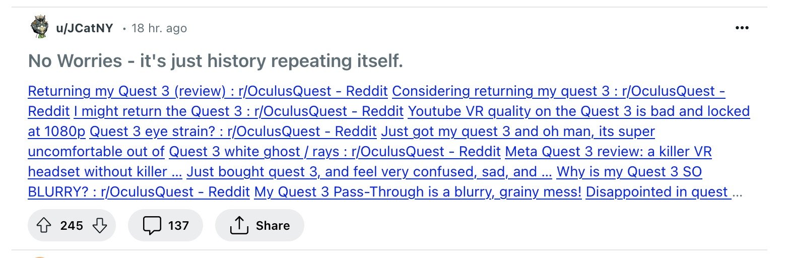 Como veis, sigo fascinado con las gafas de realidad mixta de Apple, y me ha parecido extrañamente curioso comprobar cómo la gente encontraba un montón de buenas razones para devolverlas tras haberlas comprado. Por ejemplo, que no eran cómodas. O que les hacían daño en los ojos. O que no funcionan del todo bien. O que el passthrough es un poco castaña. O que lo que las apps floten sobre el mundo real al final acaba cansando. O que para qué trabajar con ellas si es mejor trabajar con tu monitor de siempre. O, claro, que son muy caras y total, tenía 14 días para devolverlas. Las razones, por cierto, recuerdan a otro aparatito reciente,: las Quest 3, como decía JCatNY en Reddit, también fueron devueltas por algunos usuarios.