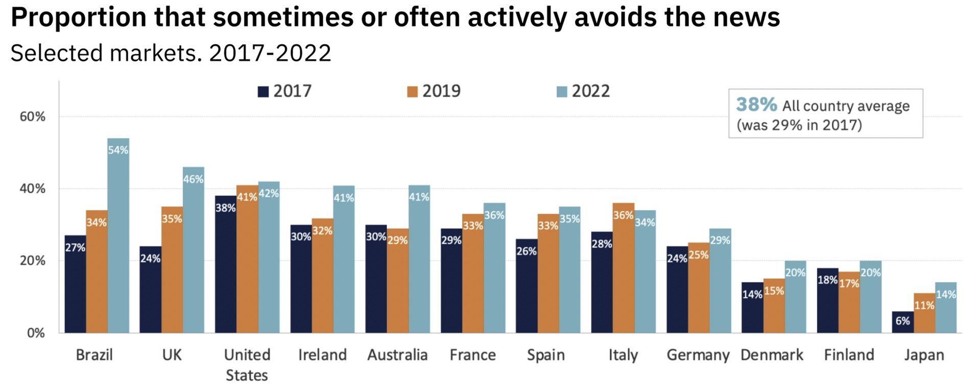 La primera y más importante, lo que decía antes: la gente pasa cada vez más de las noticias. En España por ejemplo hemos pasado de un 2017 en el que las evitaba (a menudo o alguna vez) el 26% a un 2022 en el que las evita un 35%. Hay países que las evitan aún más, desde luego, pero lo preocupante es la tónica: de media hemos pasado del 29% de la gente que intentaba evitarlas entonces a un 38% que las evita ahora.