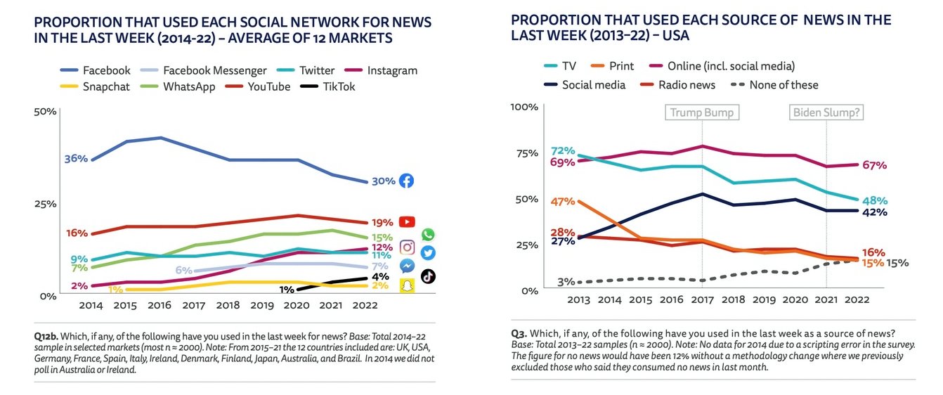 Hay más conclusiones interesanes, como las fuentes con las que la gente se informa, que son cada vez más las redes sociales. Facebook baja un poco pero sigue siendo la más usada, pero es interesante comprobar cómo TikTok, WhatsApp e Instagram son ahora teóricos medios de información.