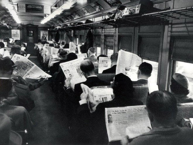 El problema es que no son, creo yo, lo mismo. La diferencia no está en esas fotos, porque hay situaciones en las que efectivamente uno trata de hacer que la espera o el trayecto sean más entretenidos leyendo un periódico o un móvil. La gente usaba el periódico como entretenimiento sobre todo cuando estaba sola. Si estabas acompañado podías leerlo, claro, pero si quedabas con un amigo o con tu pareja no sacabas el periódico, lo desplegabas y te ponías a leer como si tal cosa. No creo que casi nadie hiciera algo así por las buenas.