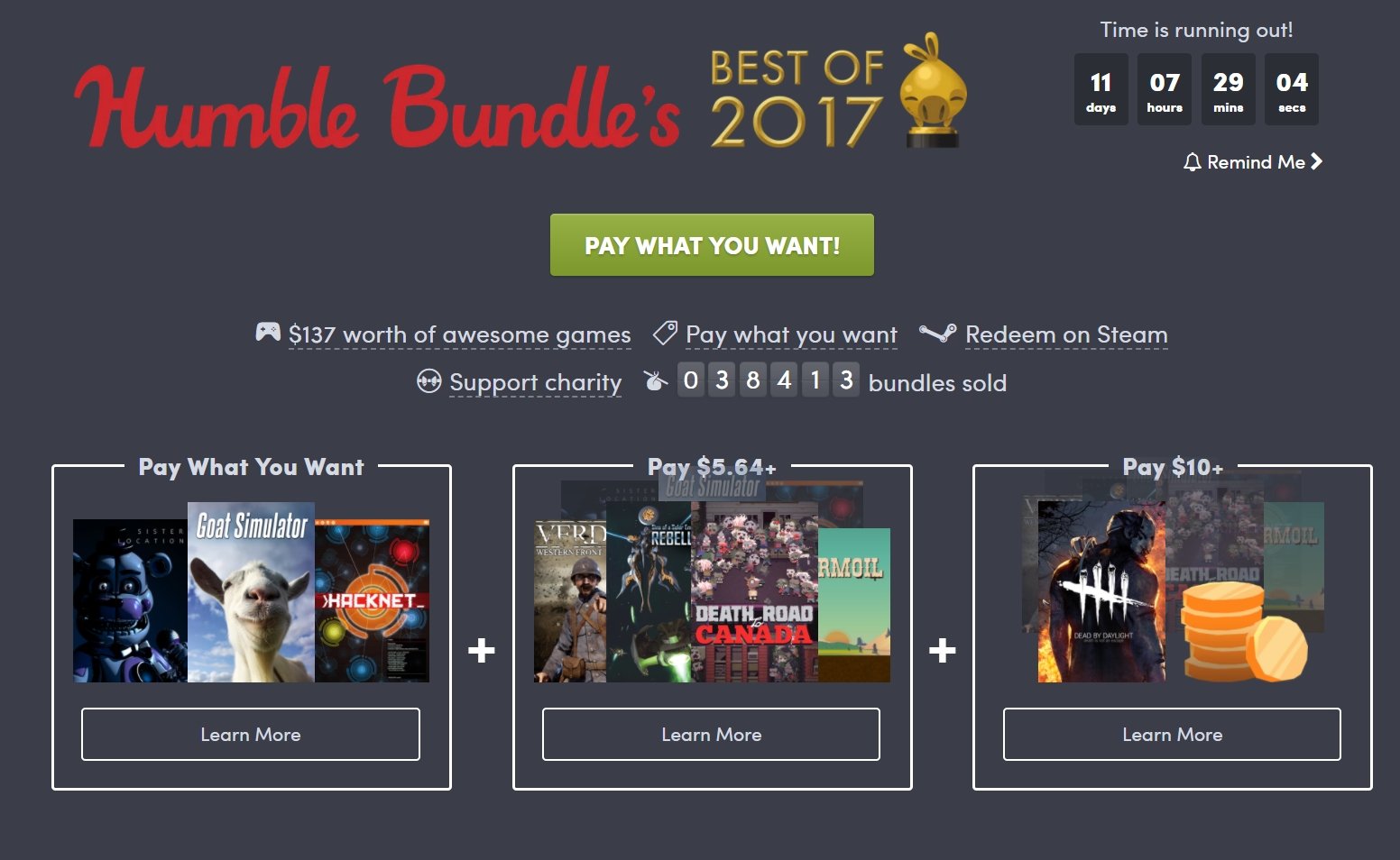 - Humble Bundle’s Best of 2017: buenos juegos en un pack como siempre llamativo. A mí me llama mucho la atención Hacknet, pero están otros como Goat Simulator, Verdun, Death Road to Canada, Turmoil o Dead by Daylight, según lo que queráis aportar, claro. Mola que podéis aportar todo a la caridad si así lo decidís. Genial, como siempre, este Humble Bundle.