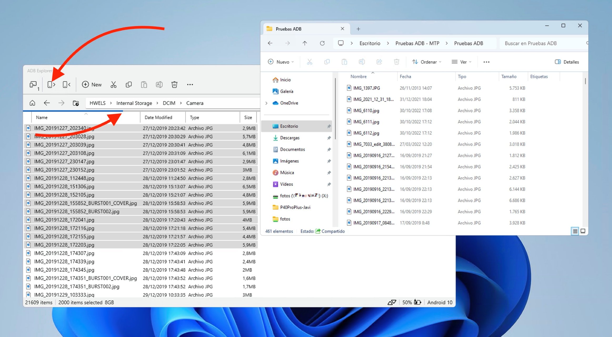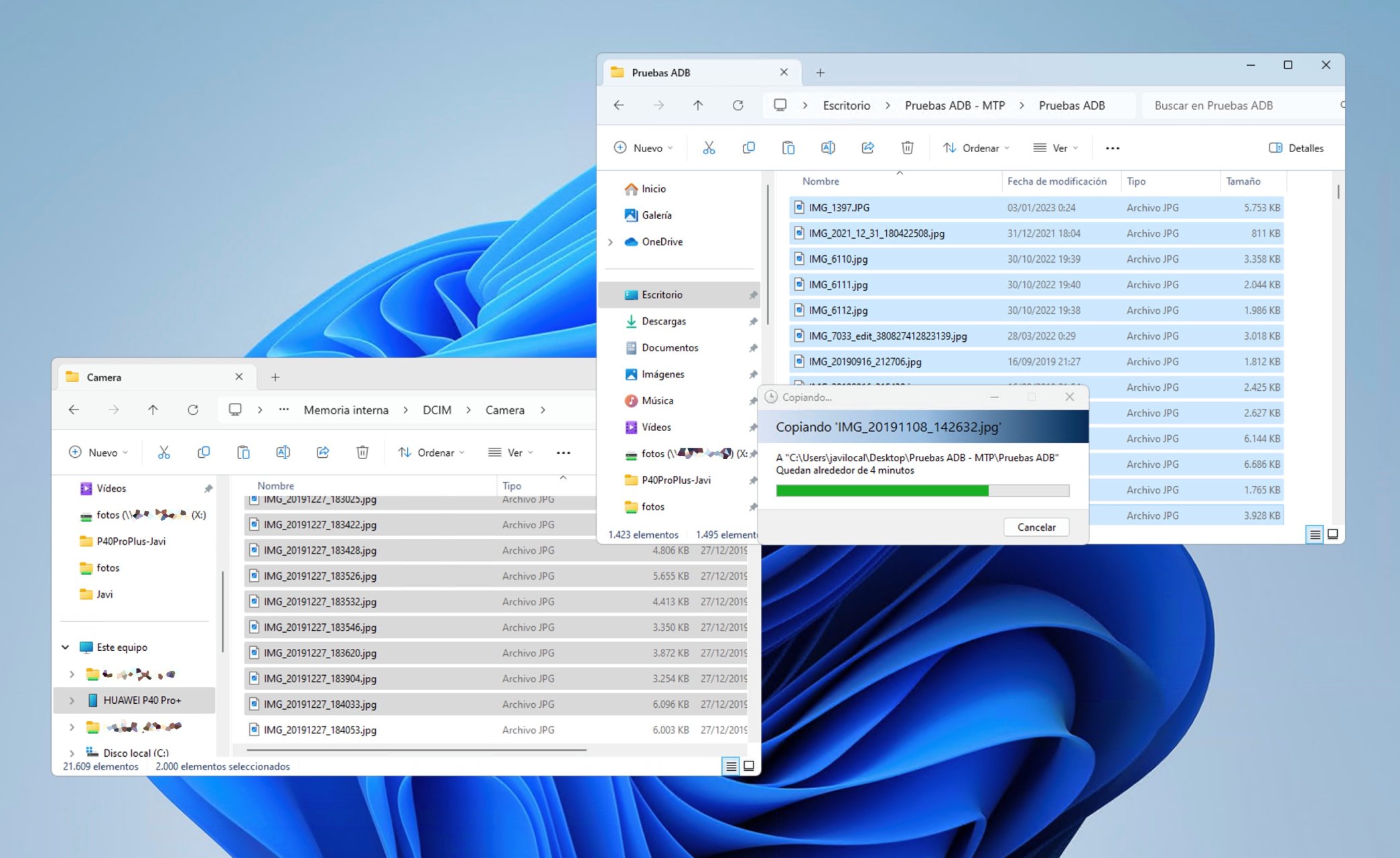 He conectado mi Huawei P40 Pro+ al PC y he querido hacer la misma operación de copia de archivos para ver cuánto tardaba MTP y cuánto ADB en dos variantes: una, desde la línea de comandos de Powershell, y otra desde ADB Explorer. Para ello he seleccionado 2.022 de los 21.600 ficheros de la carpeta Camera (los que tenía del año 2019, desde mediados de septiembre, cuando compré el P30 Pro), y los he movido a una carpeta de pruebas en el PC. En el caso de PowerShell, el comando (chivado por ChatGPT, por cierto) ha sido el siguiente: