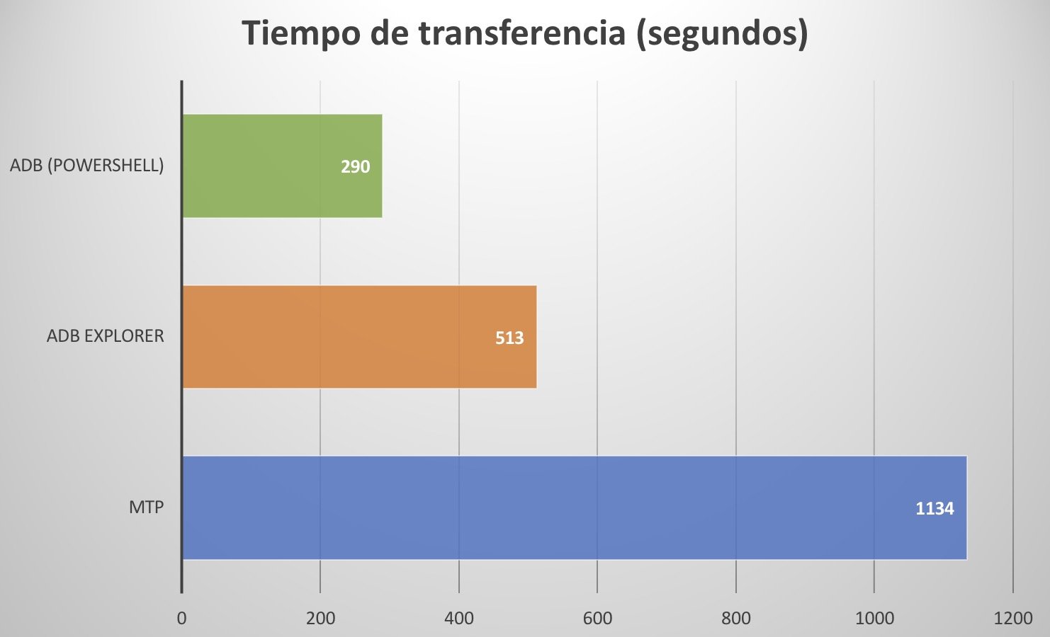 Los tiempos fueron de 18 minutos y 13 segundos para MTP, y de 8 minutos y 33 segundos para ADB Explorer y 4 minutos y 50 segundos para ADB desde un comando de Powershell: