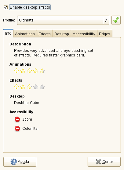 El resultado es genial: todo fluido y rápido, y es una excelente idea que te instale además el programita Simple-CCSM que permite acceder a las propiedades más importantes de Compiz Fusion para modificar sólo algunos apartados muy relevantes. Eso evita liarse demasiado con un demasiado saturado ccsm que la verdad, marea con tanta opción. En simple-ccsm disponemos de varios perfiles (yo he elegido Ultimate) que permiten habilitar mayor o menor grado de efectos y animaciones, y que de todos modos luego puedes variar en 5 o 6 cómodas pestañas. Me ha parecido simpático el nuevo modificador del efecto Desktop Cube que permite transformar el cubo en una esfera o una elipse ;)