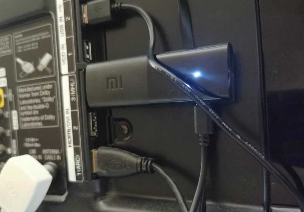 Yo no tuve que usar el adaptador de corriente, porque la toma USB de mi televisión ofrecía la suficiente potencia para hacer funcionar el Mi TV Stick, que se puso en marcha y me indicó claramente en la televisión que debía pulsar simultáneamente dos de los botones del mando para iniciar el proceso de instalación.