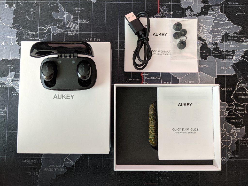Los auriculares inalámbricos de AUKEY están a 49,99 euros en Amazon, y al abrir la caja uno se encuentra con un pequeño estuche de carga, tres parejas de protectores de goma para ajustar al oído (distintos tamaños, a mí me iba bien el que colocan por defecto), un cable de carga de USB a Micro USB, el manuales de usuario y la guía rápida de uso.