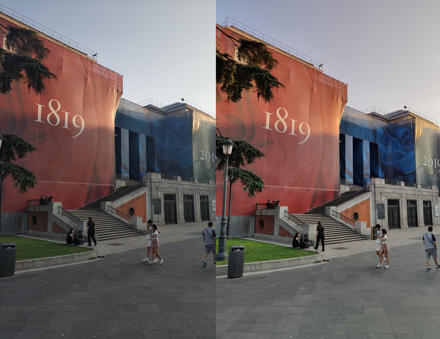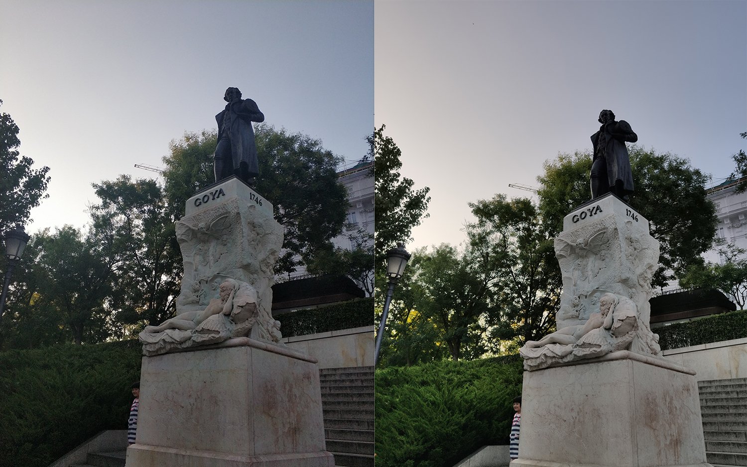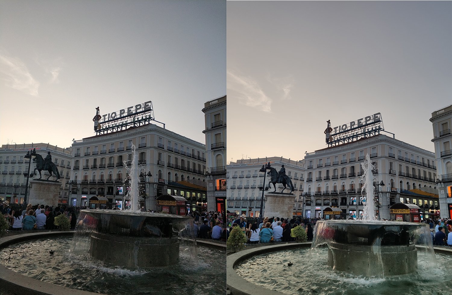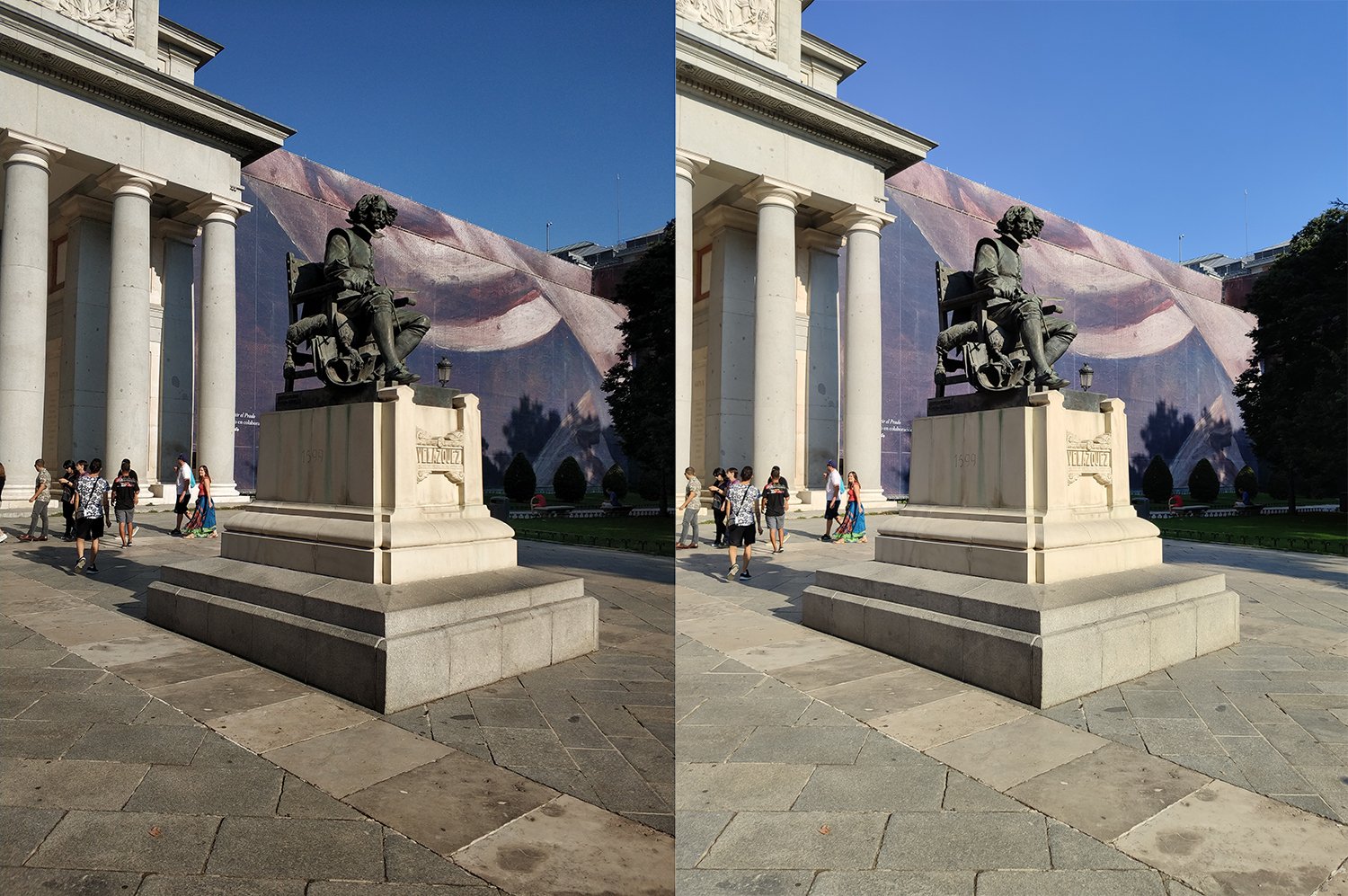 Si en todo lo demás no era para tanto, ¿qué pasa con las cámaras? Pues que tampoco son para tanto. El otro día me di un paseo por el Museo del Prado y por el centro de Madrid, así que pude sacar unas cuantas fotos con los dos para comparar. No dentro del Prado, porque sorprendentemente uno no puede sacar fotos con el móvil, ni con flash ni sin él. Es algo que llama la atención porque por ejemplo estuve en el Louvre el año pasado y allí puedes hacer fotos hasta haciendo el pino. Supongo que en el Prado tienen la idea (coherente) de que si vas a ver cuadros ponte a verlos y deja de sacar fotos. Me gusta el razonamiento, aunque no estoy seguro de que sea ese el argumento. Dicho lo cual, paso a mostrar las capturas que como veréis en la primera (después he pasado de añadir rótulos) siempre son iguales: el Mi 6 a la izquierda, el Mi 9 a la derecha: