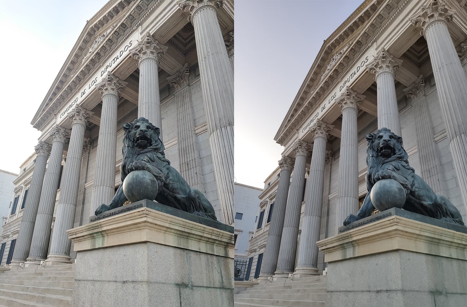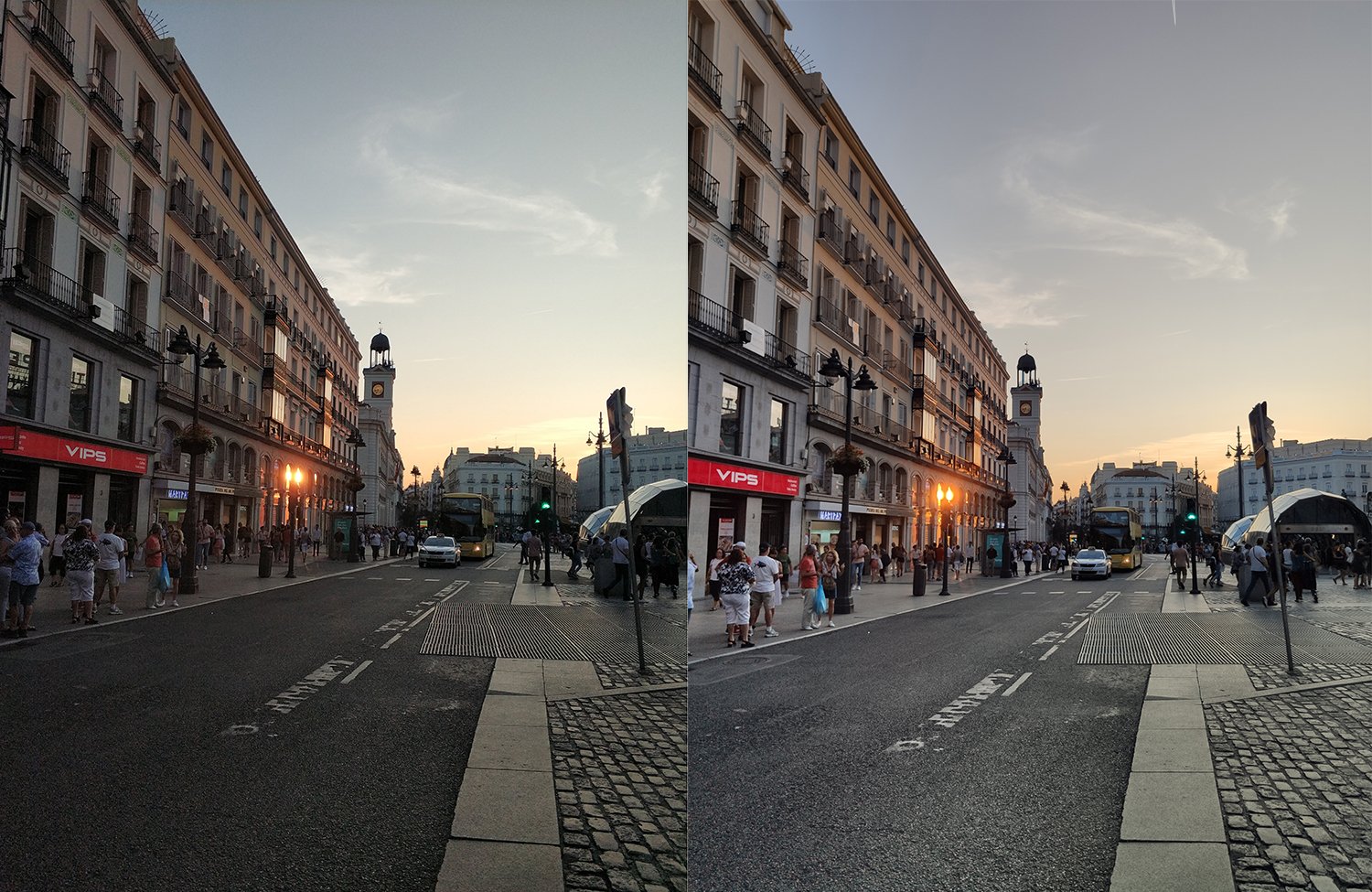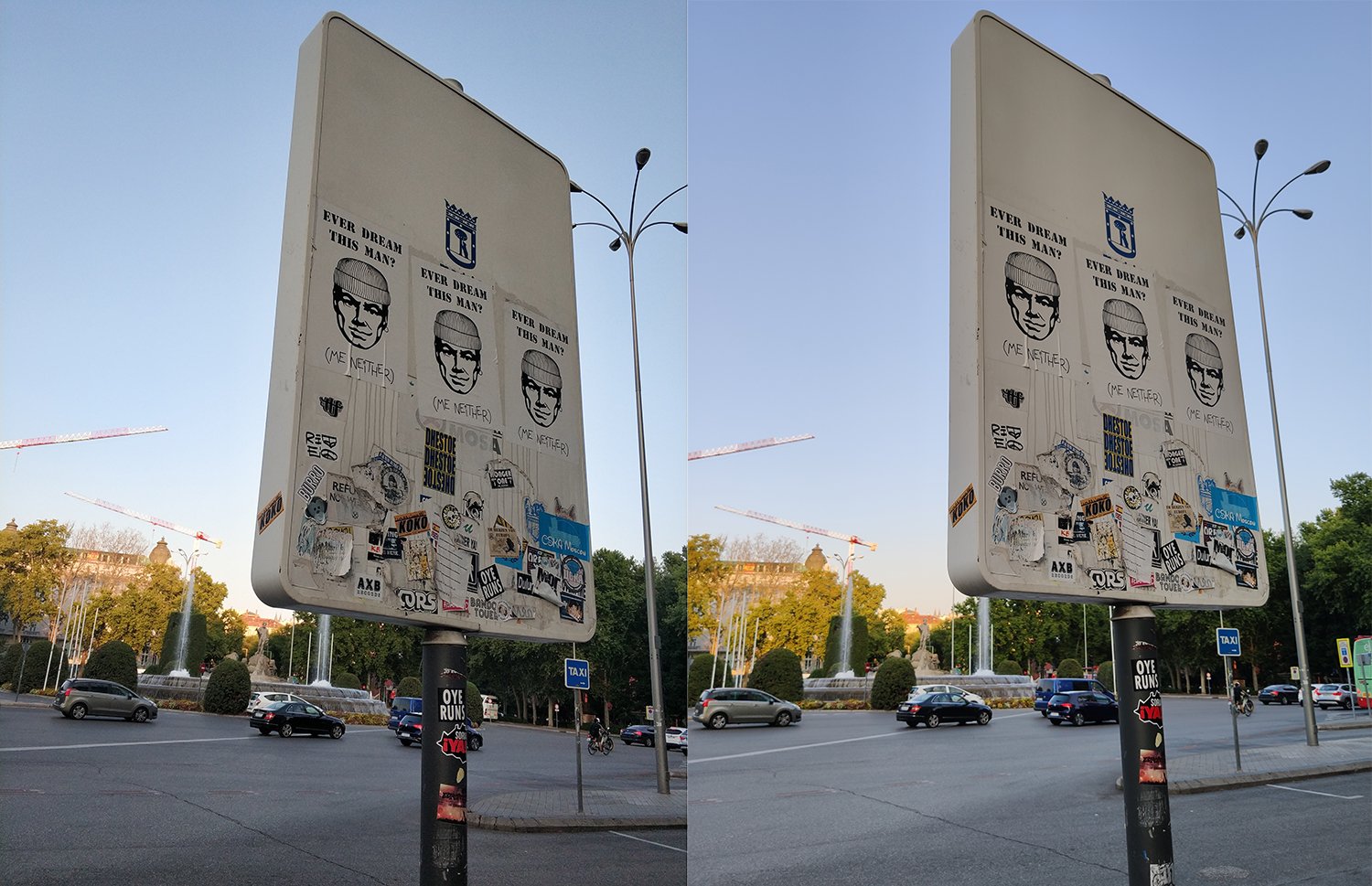 Si en todo lo demás no era para tanto, ¿qué pasa con las cámaras? Pues que tampoco son para tanto. El otro día me di un paseo por el Museo del Prado y por el centro de Madrid, así que pude sacar unas cuantas fotos con los dos para comparar. No dentro del Prado, porque sorprendentemente uno no puede sacar fotos con el móvil, ni con flash ni sin él. Es algo que llama la atención porque por ejemplo estuve en el Louvre el año pasado y allí puedes hacer fotos hasta haciendo el pino. Supongo que en el Prado tienen la idea (coherente) de que si vas a ver cuadros ponte a verlos y deja de sacar fotos. Me gusta el razonamiento, aunque no estoy seguro de que sea ese el argumento. Dicho lo cual, paso a mostrar las capturas que como veréis en la primera (después he pasado de añadir rótulos) siempre son iguales: el Mi 6 a la izquierda, el Mi 9 a la derecha: