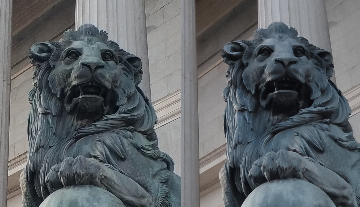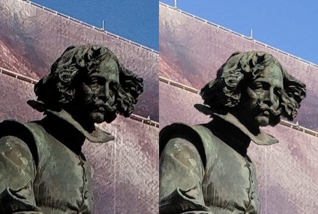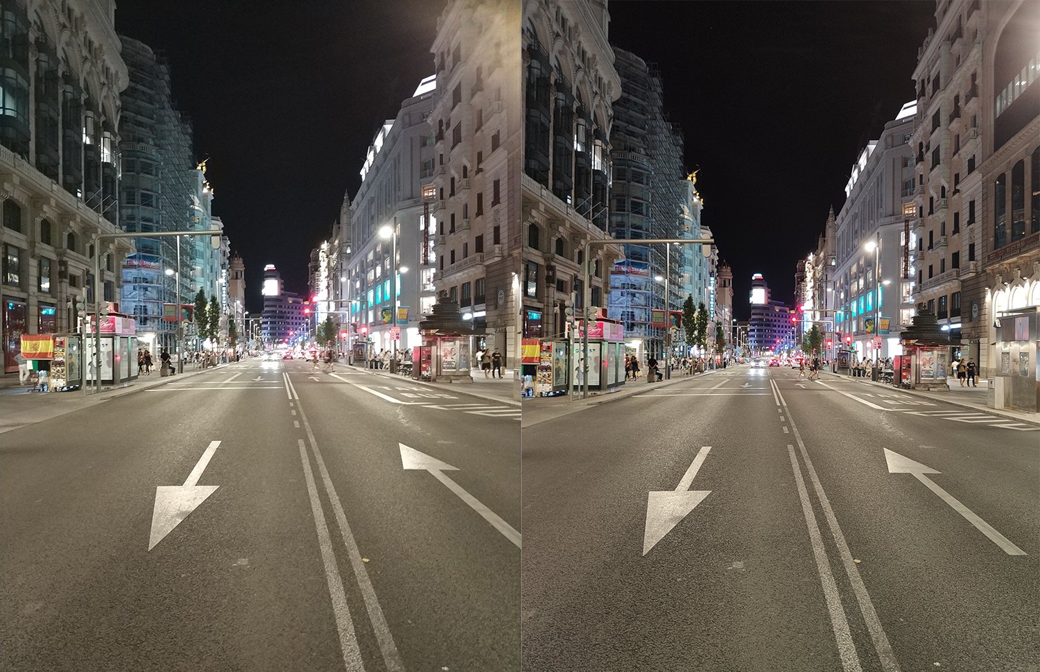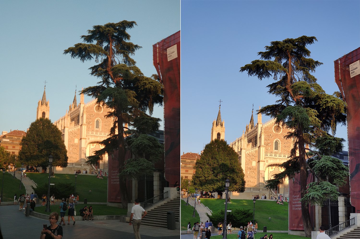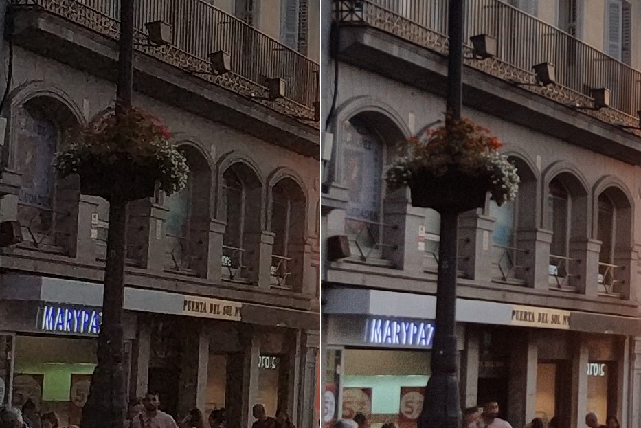 Si en todo lo demás no era para tanto, ¿qué pasa con las cámaras? Pues que tampoco son para tanto. El otro día me di un paseo por el Museo del Prado y por el centro de Madrid, así que pude sacar unas cuantas fotos con los dos para comparar. No dentro del Prado, porque sorprendentemente uno no puede sacar fotos con el móvil, ni con flash ni sin él. Es algo que llama la atención porque por ejemplo estuve en el Louvre el año pasado y allí puedes hacer fotos hasta haciendo el pino. Supongo que en el Prado tienen la idea (coherente) de que si vas a ver cuadros ponte a verlos y deja de sacar fotos. Me gusta el razonamiento, aunque no estoy seguro de que sea ese el argumento. Dicho lo cual, paso a mostrar las capturas que como veréis en la primera (después he pasado de añadir rótulos) siempre son iguales: el Mi 6 a la izquierda, el Mi 9 a la derecha: