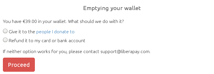 ¿Qué significa esto? Pues que si sois "donantes" tendréis que vaciar vuestra cartera como se indica aquí. El servicio os da la opción de donar lo que os queda en la cartera de LiberaPay a la gente en cuyos proyectos colaborábais, o bien reembolsar esa cantidad a vuestra cuenta bancaria.