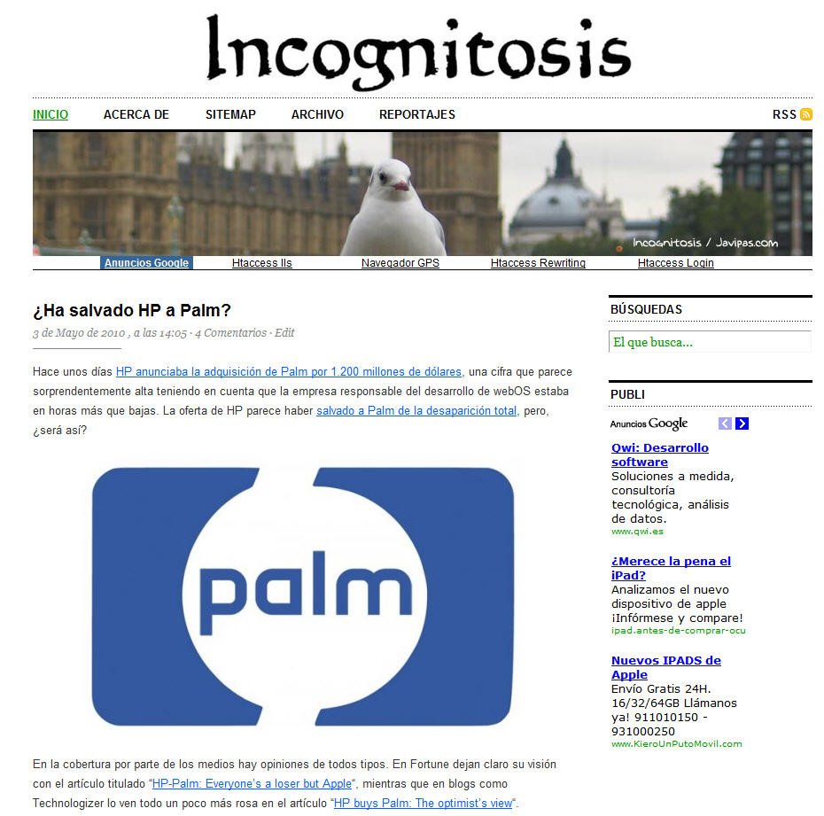 Puede que algunos recordéis aquel Incognitosis 3.0. El diseño era simple pero efectivo: el logo era el mismo que conservo hoy, pero debajo estaba la fotito de gaviotas —había un carrusel aleatorio de cinco, creo recordar— y luego las entradas ordenadas cronológicamente. Pero lo otro que había era publicidad a través de AdSense.
