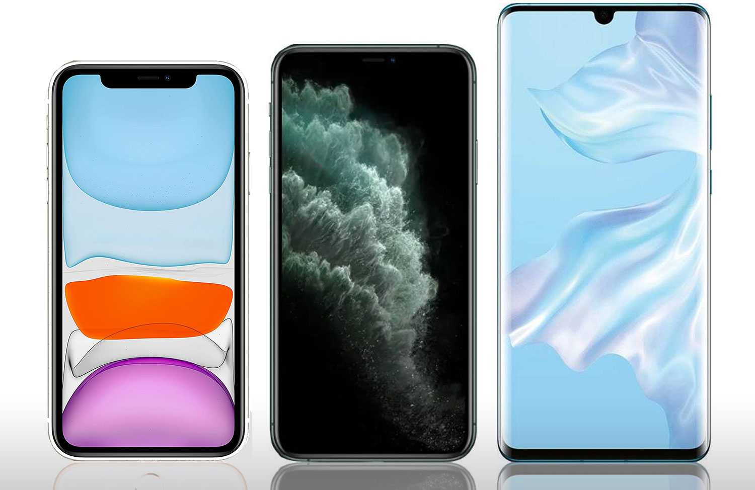 A la izquierda, el teórico iPhone 12 de 5,4 pulgadas, que tendría dimensiones muy similares a las del actual iPhone SE. A su derecha el iPhone 11 Pro de 6,1 pulgadas (bien por esa diagonal también, por cierto, lástima que salga tan cara) y mi Huawei P30 Pro, que es un gigante al lado de estos dos.