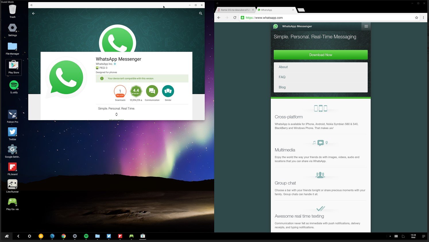 Para empezar, la primera sorpresa agradable. WhatsApp funciona. Al principio parece que no lo hace, claro: si intentas instalarla desde Play Store te indica que tu dispositivo no es compatible -tampoco tenemos tarjeta SIM así que estamos apañados-, pero si accedes a WhatsApp via web en Chrome el navegador detecta que estás en Android y te redirige a la descarga en Play Store. La solución es sencilla: en las opciones de Chrome activas lo de “Request desktop site”… et voila! Aparece el código QR para escanear, a partir de lo cual uno ya puede utilizar este cliente tranquilamente. Lástima no poder fijar la pestaña, pero no es un problema grave.