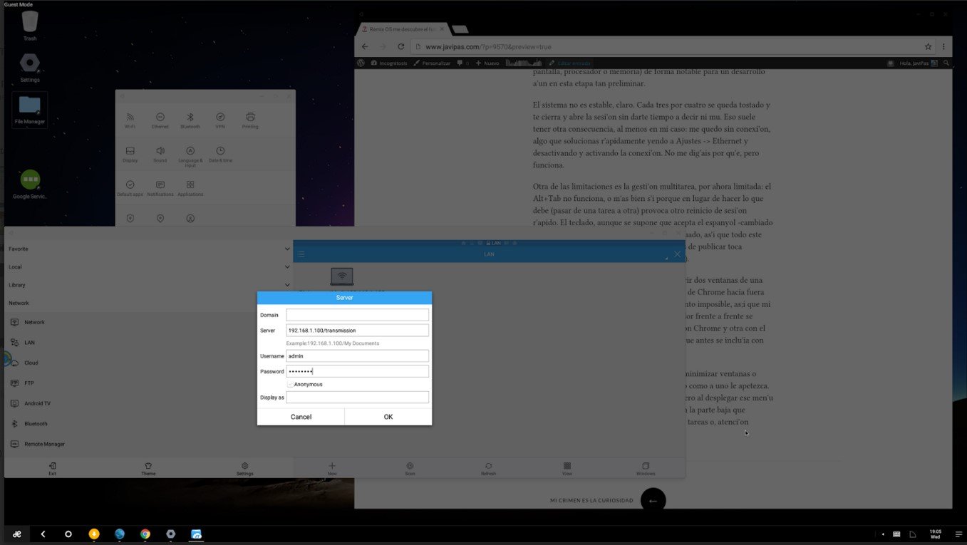 Más molesta es la limitación de no poder abrir dos ventanas de una misma aplicación. Eso de sacar una pestaña de Chrome hacia fuera para generar una nueva ventana es de momento imposible, as;i que mi costumbre de tener dos ventanas del navegador frente a frente se resuelve de forma alternativa: una ventana con Chrome y otra con el navegador nativo de Android-x86, que es el que antes se incluía con Android también en móviles.