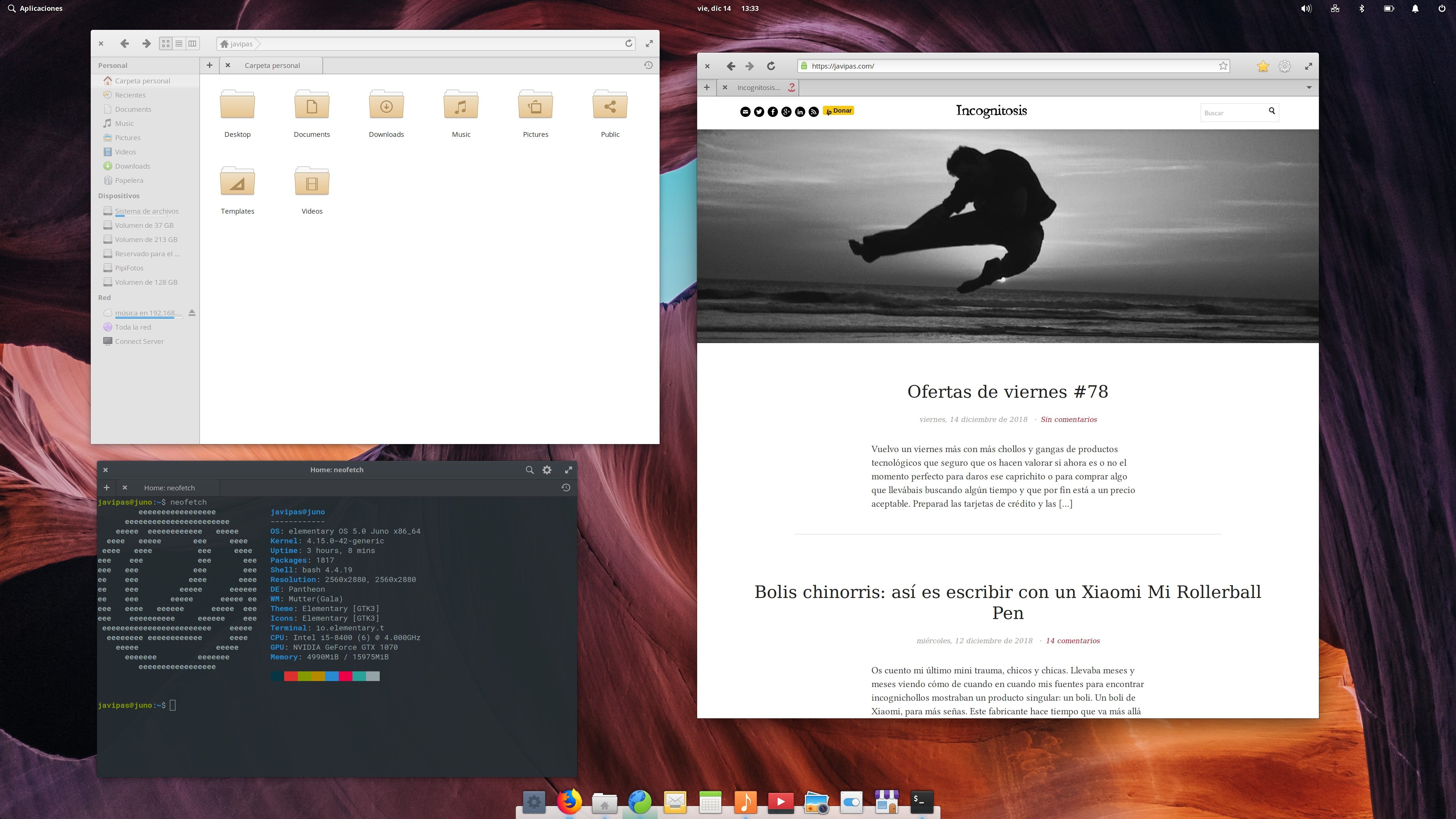 Como escritorio, la verdad, creo que está genial. La imagen de fondo es esta, y me inspiró uno de esos miles de escritorios Linux chulos que la gente publica en /r/unixporn. Al final dediqué más tiempo a dejar la interfaz a mi gusto que a otra cosa, y de hecho sigo investigando porque no estoy del todo contento con las tipografías de los navegadores (lo noto un montón en sitios como Techmeme, que se ve raro en Firefox, por ejemplo). Podría haceros una lista con los componentes, pero para eso tenemos neofetch, ¿no?