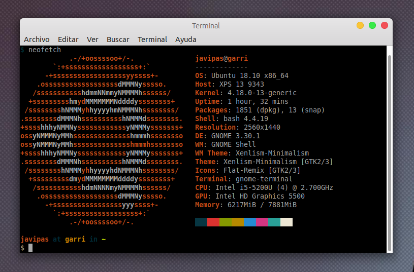 Así que tras aquel día de experimentos acabé instalando Ubuntu 18.04, sin más. La interfaz por defecto me apesta bastante, no me gusta nada el dock a la izquierda y el nuevo tema por defecto de las ventanas, llamado Yaru, me parece bastante feo. Total, que me puse a maquearla un poco y acabé con esto.