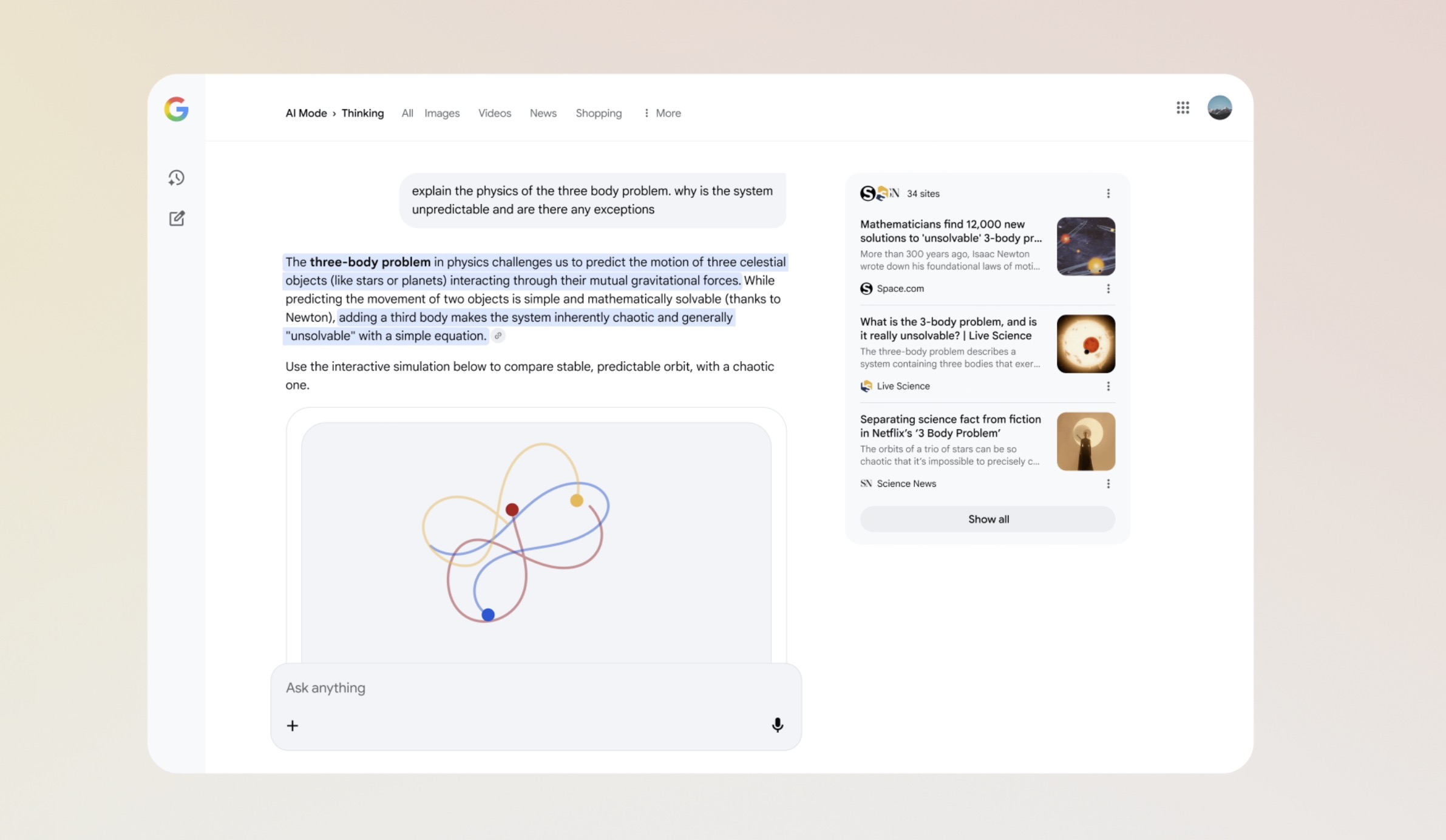 ¿Por qué? Pues porque a las respuestas en texto les podrá añadir según convenga fotos, vídeos o imágenes interactivas como esta que usa al explicarle al usuario de qué va eso del problema de los tres cuerpos. Por ejemplo.
