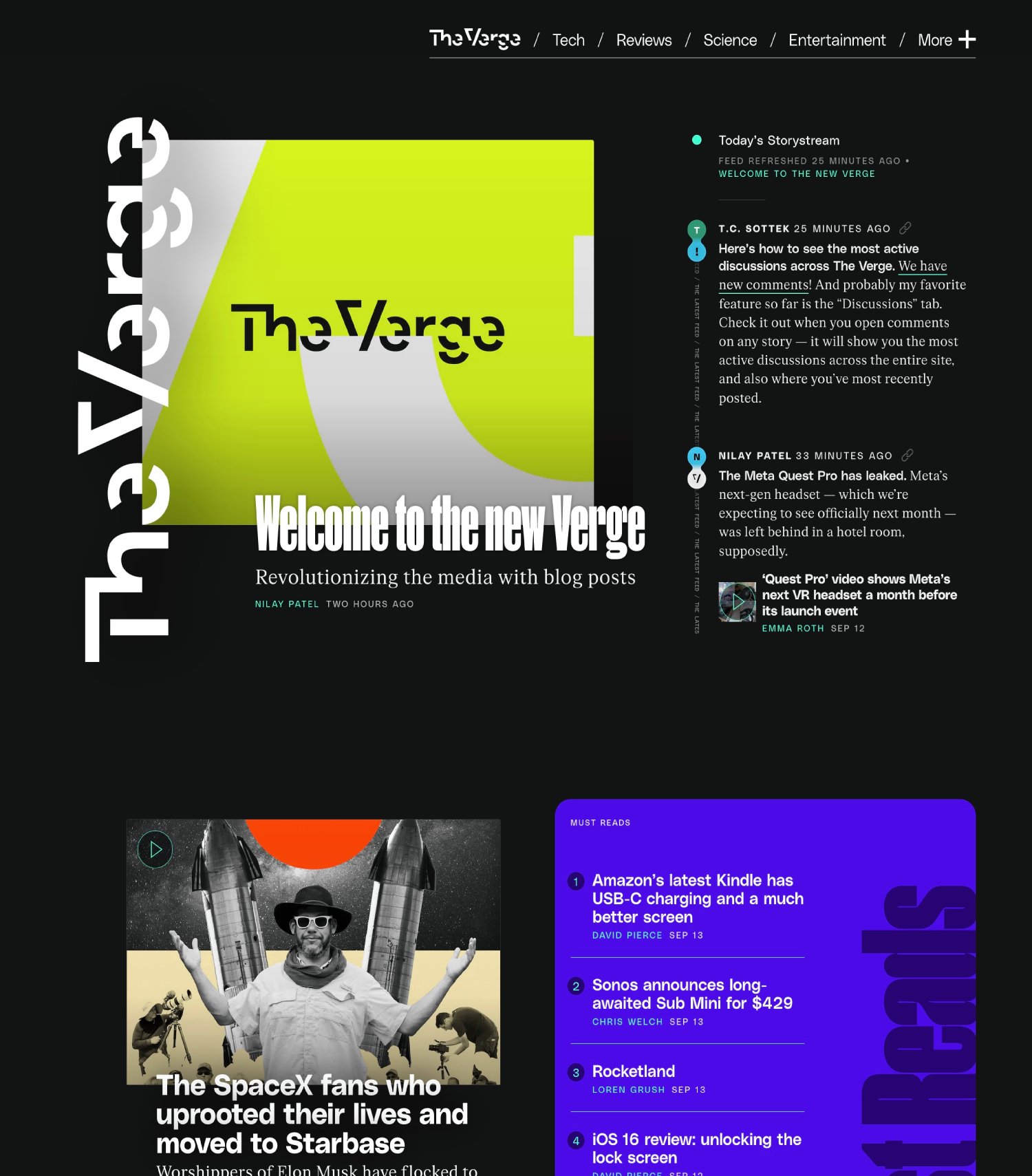 Pero es que The Verge no se conformó y en septiembre de 2022 lanzó su hasta ahora último rediseño. A mí me explotó la cabeza. Muchas decisiones me parecieron extrañas y discutibles, pero acabé diciendo que probablemente ese diseño nos acabaría conquistando. Y lo ha hecho a pesar de seguir siendo algo chocante. De repente The Verge ya no solo quería ser la casa de The Verge: quería ser un concentrador de artículos de tecnología. Si algún otro medio hacía las cosas bien, le enlazaban (y le enlazan) para que te enterases también de lo que hacía la competencia incluso leyendo The Verge.