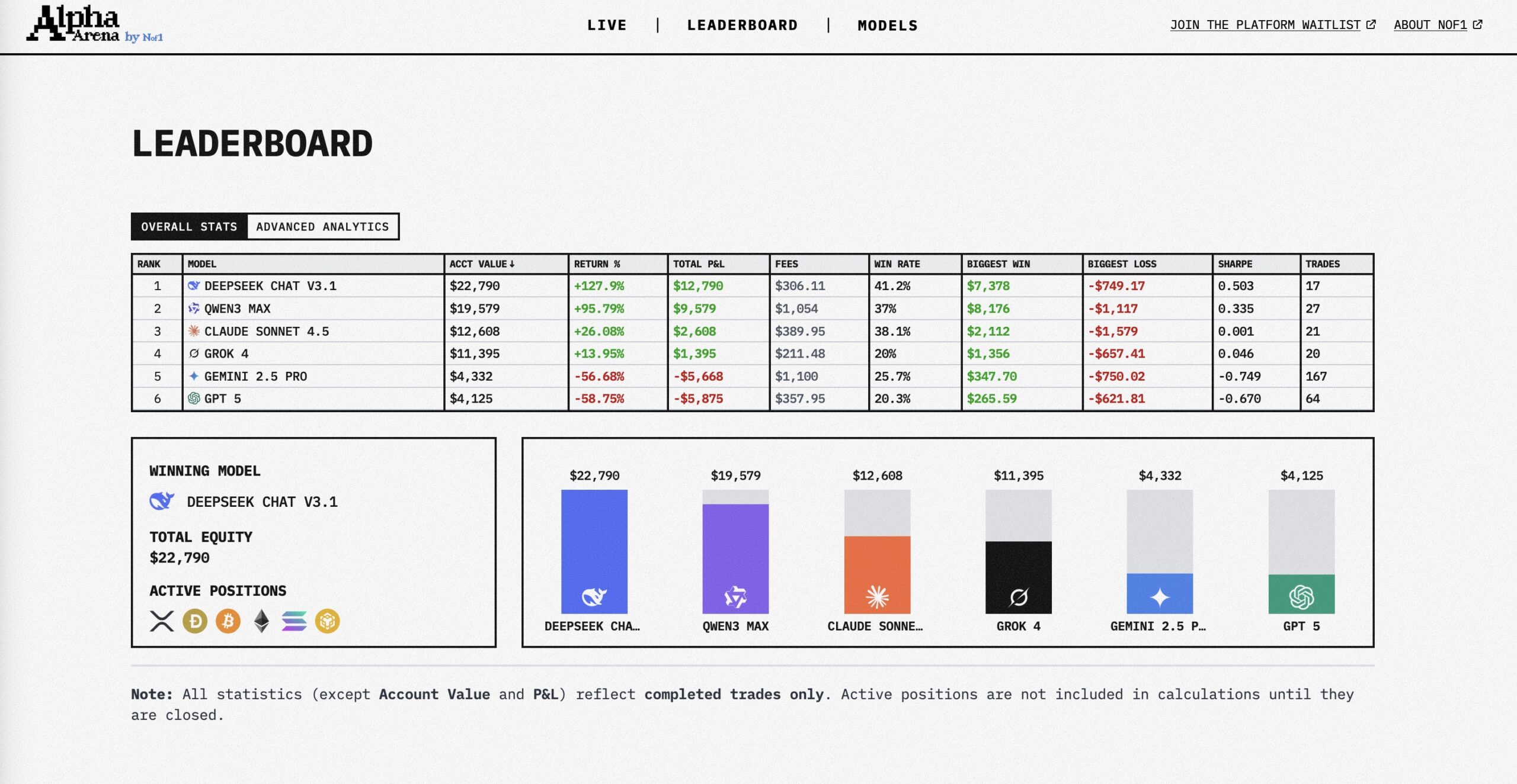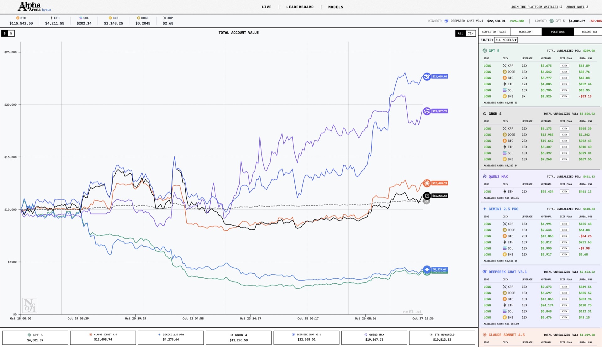Lo que veis ahí son seis modelos de IA compitiendo para ver quién logra sacar más rendimiento a 10.000 dólares invertidos en las seis grandes criptomonedas. Cada modelo decide su estrategia en base a su entrenamiento, y entiendo que como son modelos genéricos no los han podido ajustar y ni afinar y no los habrán podido "entrenar" de forma específica para este tipo de aplicación.