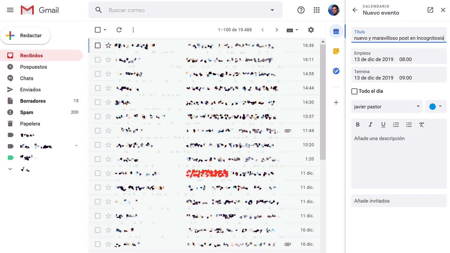 Aquí Gmail —por favor, deja de ser tan perfecto— se ha convertido una vez más en mi involuntario salvador, sobre todo por esa nueva opción de posponer los correos que permite dejar para mañana lo que no puedas quieras hacer hoy. Si llega un mensaje que puedo leer más tarde, lo pospongo (por cierto, Google, molaría un desplegable rápido que mostrara "Posponer X horas" como opción adicional a las que ofreces), y si es un recordatorio que yo me mandé en forma de correo, lo hago en ese momento, lo pospongo o, si es algo más relevante acabo creando una cita de calendario con ese acceso que hace tiempo Gmail incluyó como parte de su servicio web. Esas citas, además, están configuradas para que siempre me llegue un correo 10 minutos antes de la hora a la que las establezco.