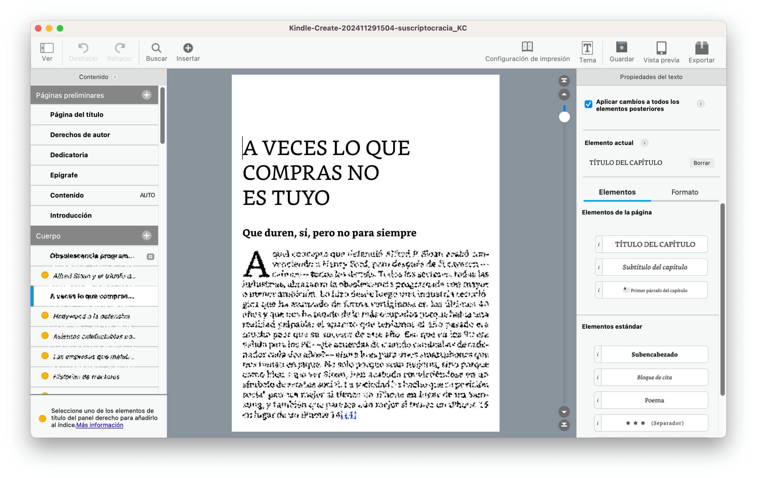 No solo eso: con Kindle Create puedes añadir las páginas preliminares (dedicatoria, prefacio, tabla de contenidos, etc) y las finales (agradecimientos, epílogo, etc). Todo eso está muy estudiado y es totalmente estándar, pero mi DOCX original ya las tenía creadas y tuve que cortar esas partes y pegarlas en esas páginas preliminares y finales para que todo quedara bien. La herramienta incluso genera una tabla de contenidos algo básica en mi opinión, pero que también es funcional: en la versión ePub incluye los enlaces, y en la impresa los números de página de cada capítulo.