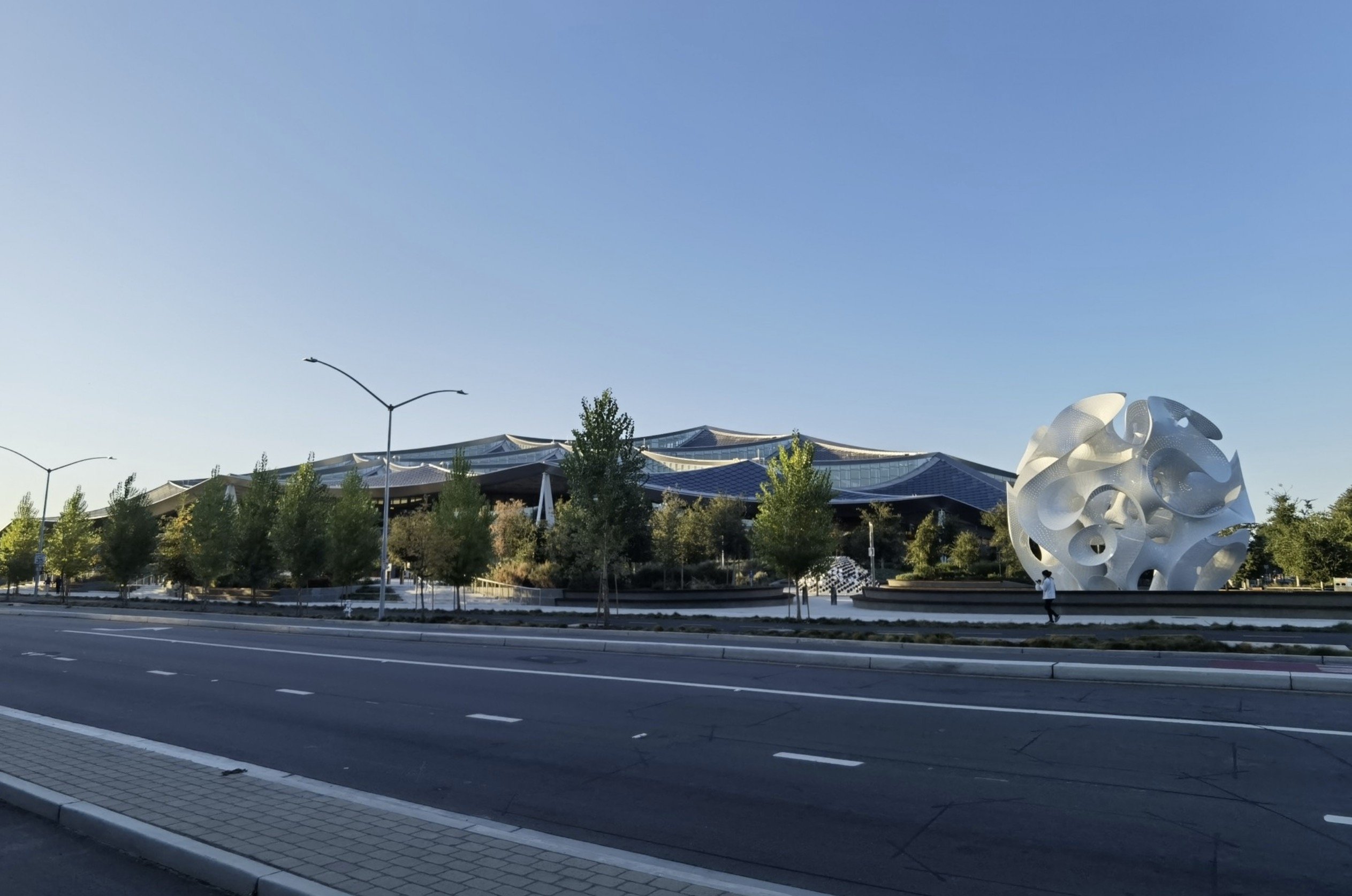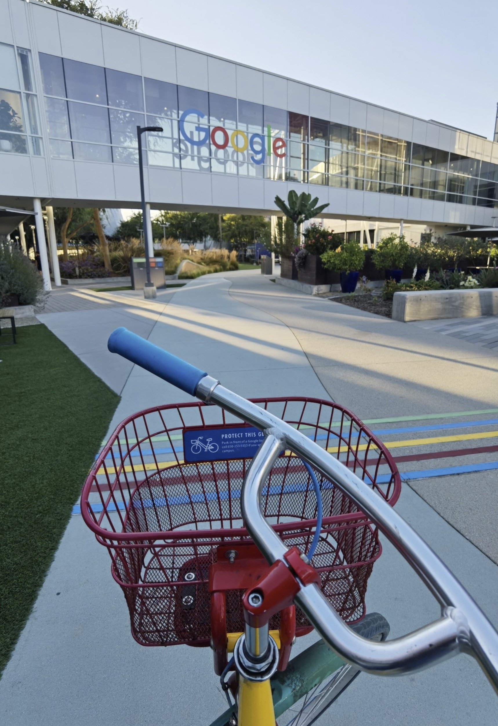 La organización del viaje fue perfecta, y aunque el trayecto es largo, la cosa se hizo llevadera. Nada más llegar, ratito de descanso que aproveché para darme una vuelta desde el hotel al campus de Google —que estaba pegado— y coger una de sus famosas bicicletitas o ver el nuevo edificio Gradient Canopy, que es una verdadera chulada con sus tejados solares. Desde la calle, la verdad, se ve poco porque es un edificio muy bajo tapado por árboles, pero molar, mola. Lástima que solo lo vi por fuera: lo abren al público el próximo 12 de octubre, porras. El ambiente, por cierto, llamativo: se veía a muy poca gente (17.30 de la tarde allí) y parece bastante claro que allí la gente se mueve en coche porque las distancias son enormes. Por cierto: si EEUU es el reino del iPhone, Silicon Valley es el reino de Tesla. Parece como si los regalaran, carallo.