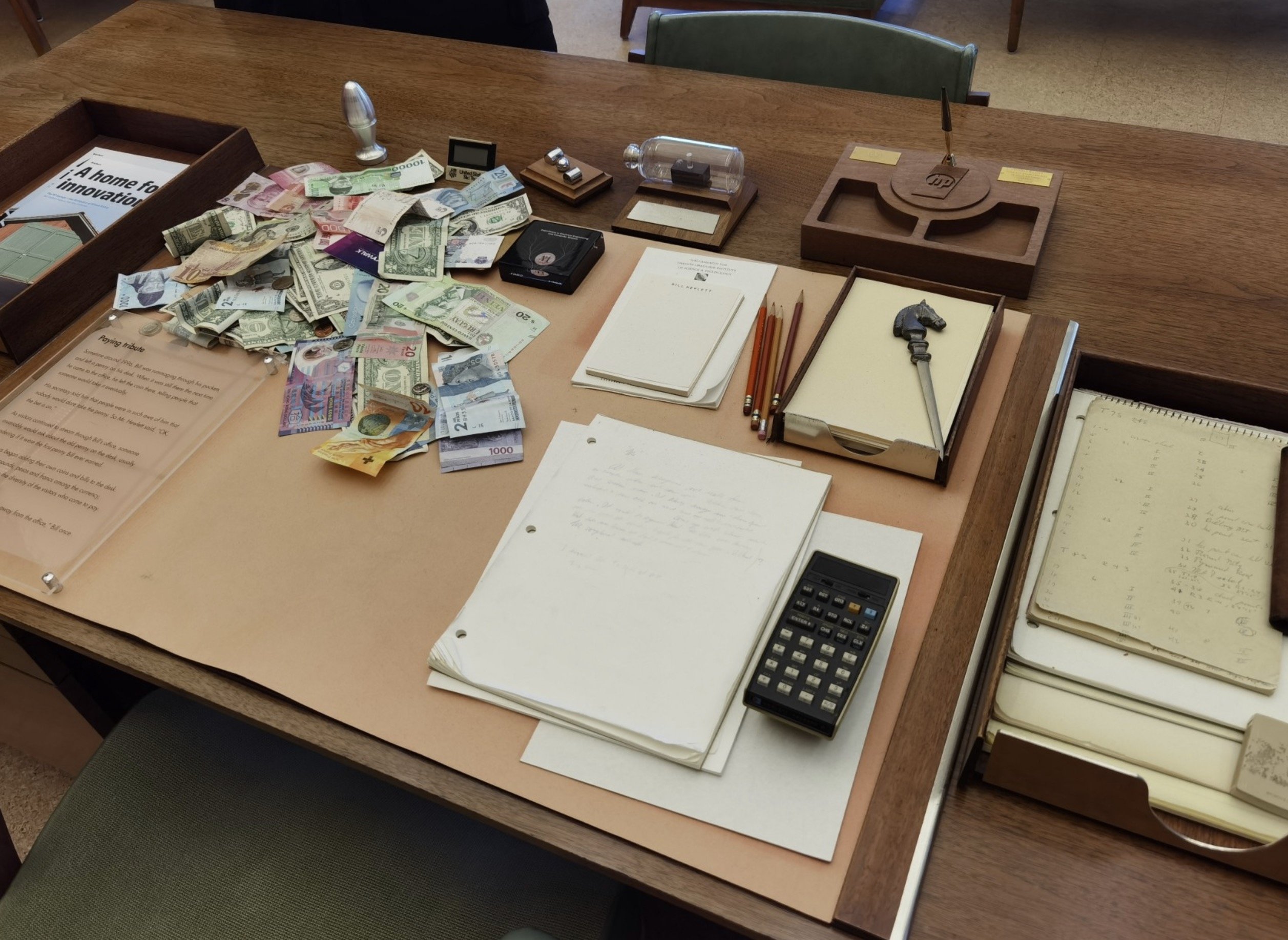 Incluso tuvimos tiempo de ver las oficinas originales de Bill Hewlett y Dave Packard, que se conservan tal cual y que son un verdadero viaje al pasado. Nos contaron anécdotas simpáticas como la de los billetes encima de la mesa de Bill —los ingenieros los dejaban a modo de broma cuando volvían de viaje— o la calculadora que usaba, que tiene una historia conocida pero simpática. Bill Hewlett exigió que la primera calculadora que fabricase su empresa cupiese en el bolsillo de la camisa. Los ingenieros no lograban reducir tanto su tamaño, así que hablaron con su mujer y la convencieron de que hiciese el bolsillo de la camisa más grande. Cupo, y la calculadora (la HP-65) se acabó vendiendo de forma masiva.