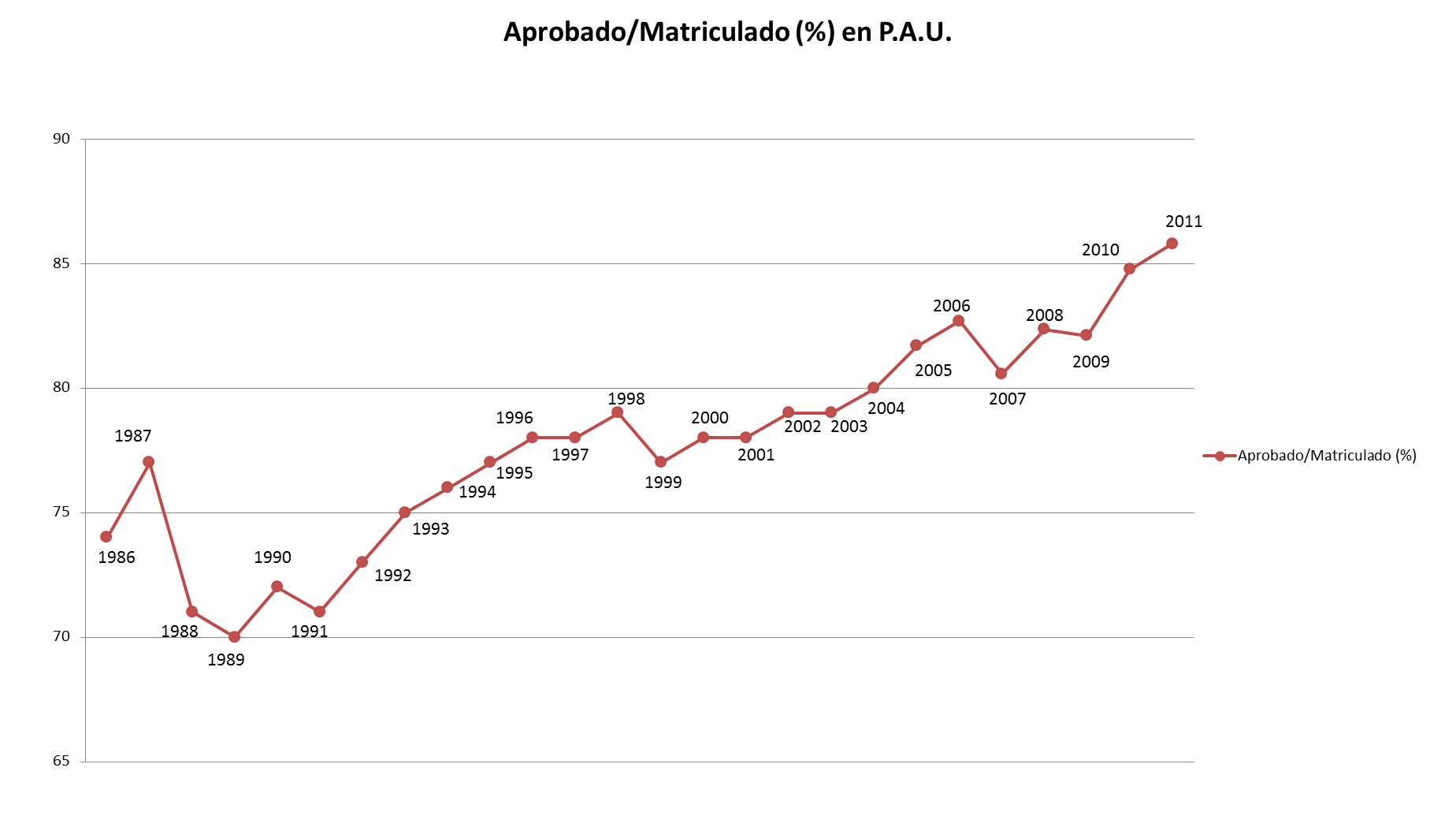 Ese gráfico está incompleto, y ese crecimiento de aprobados ahora supera el 95%, como iba diciendo. Yo hice la selectividad en junio de 1991, y entré en la Facultad de Informática en septiembre de aquel año. Según ese gráfico, parece claro que los que la hicimos éramos malos estudiantes: apenas aprobaba el 70% de los alumnos.