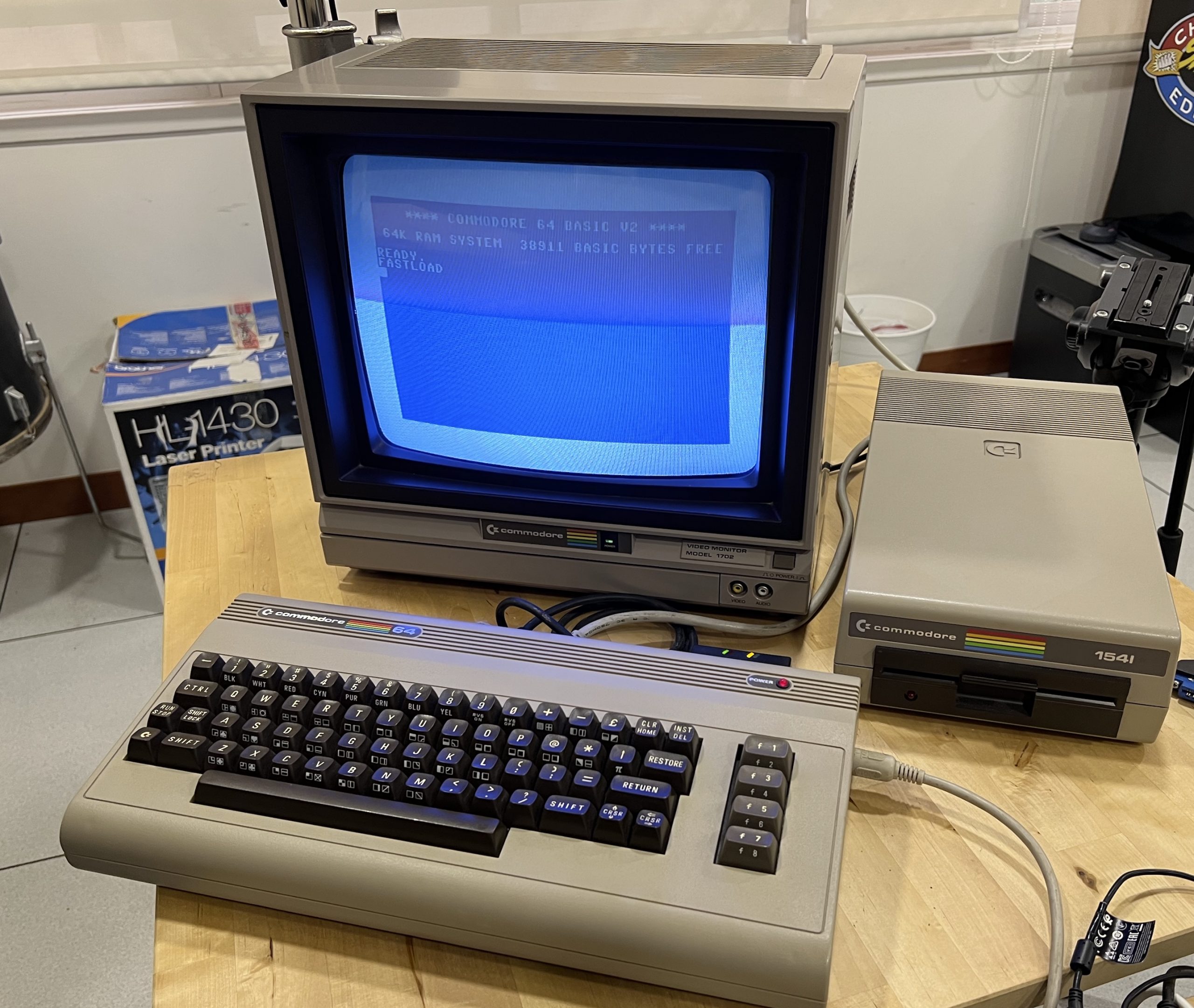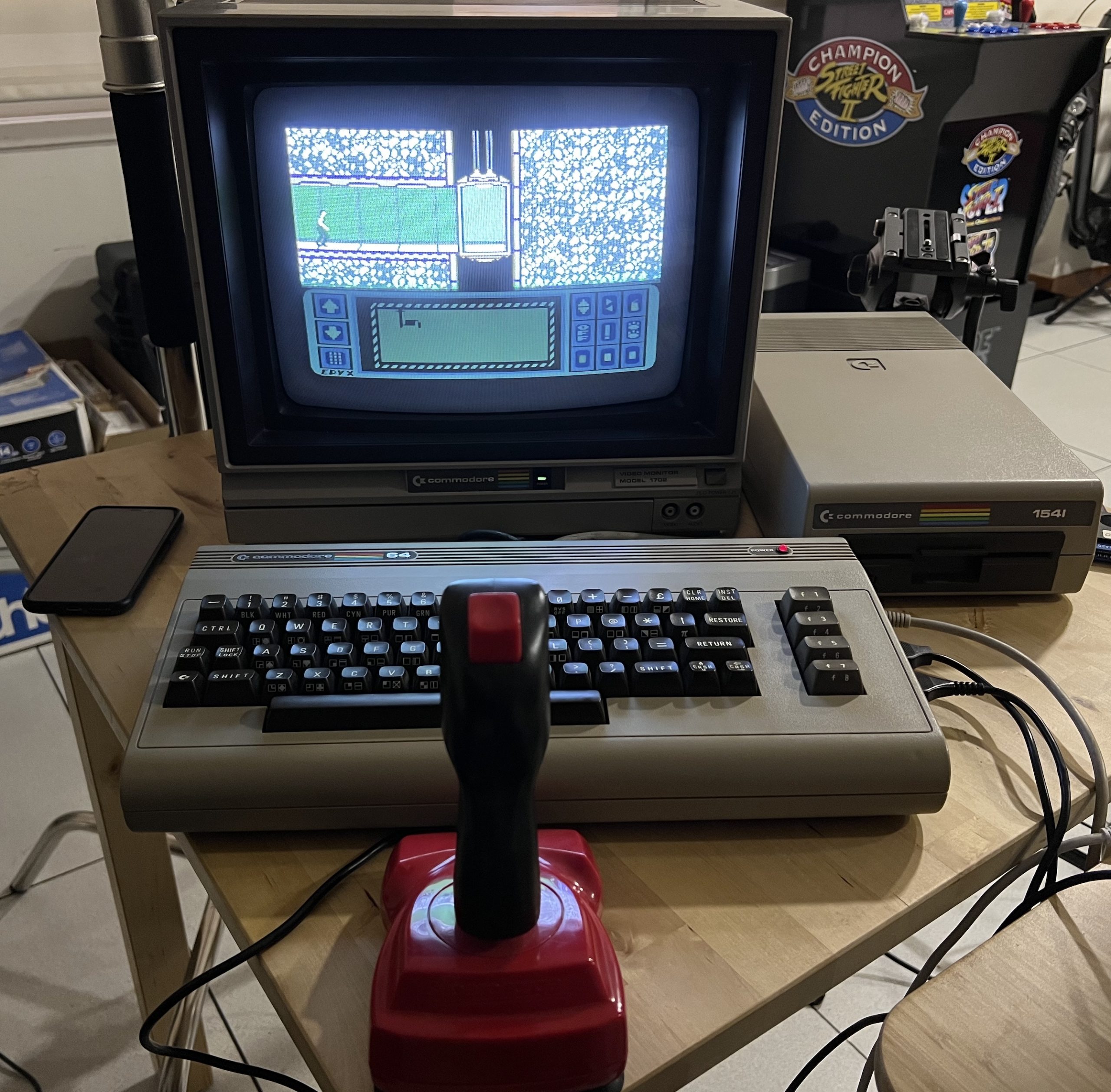 Pronto nos centramos en el C64, que tenía impoluto y con su particular joya de la corona: el monitor Commodore 1702 de 13 pulgadas que daba una calidad de imagen fantástica. Al lado tenía la disquetera Commodore 1541, aunque en realidad no hizo falta, porque asomando en la foto aparece el módulo 1541 Ultimate II que emula esa unidad y que básicamente permite que tengas cientos (miles) de juegos en formatos t64 (cinta) o d64 (disco), por ejemplo con carga mucho más cómoda y —si quieres— rápida que en el modelo original.