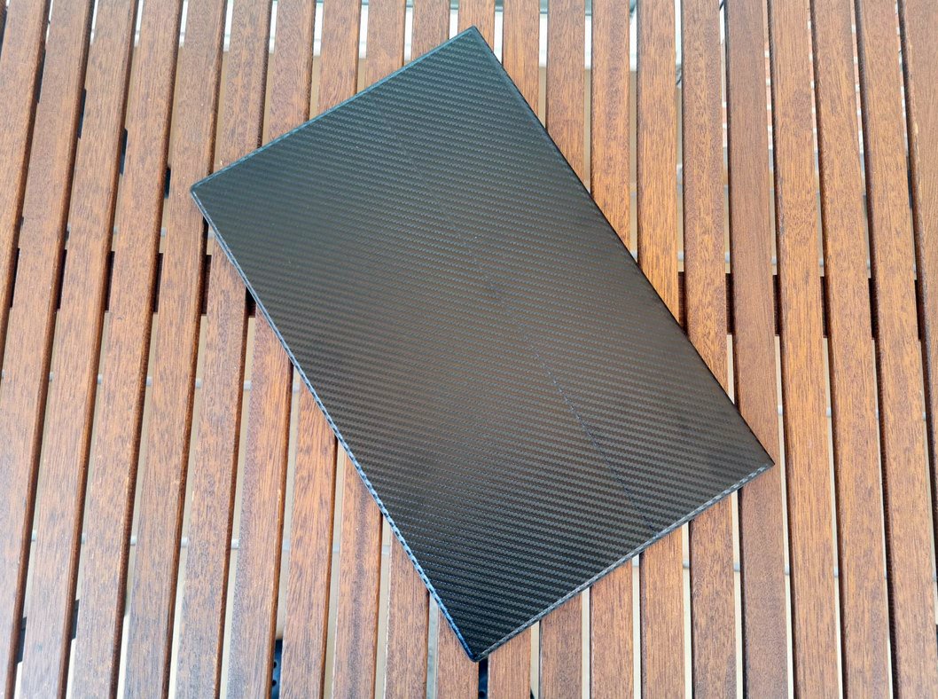 La pantalla está protegida por una funda con un acabado que imita la fibra de carbono y que cumple con una importante segunda función: es también un soporte magnético. Eso permite apoyarla sobre una mesa y lograr distintos ángulos de inclinación para adaptarla a nuestras necesidades. El frontal tiene marcos muy reducidos en tres de sus lados: solo el inferior es pronunciado, algo casi deseable para poder cogerla sin llenar el panel de huellas.