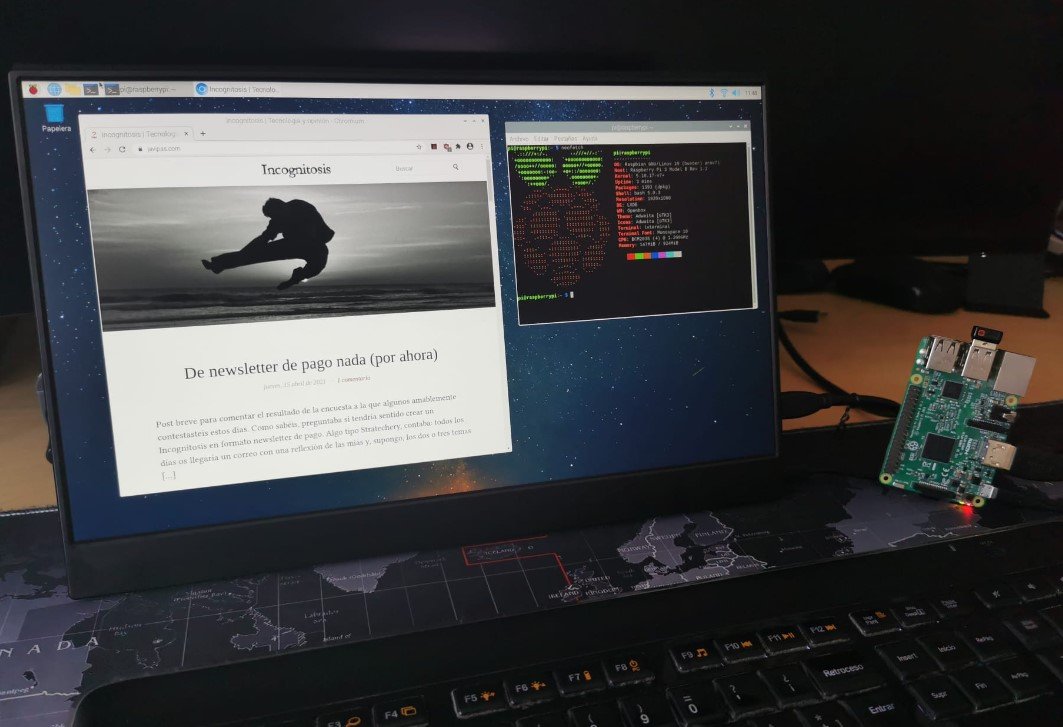 Otra de las opciones claras para mí a la hora de usar este monitor externo es el de conectarlo a una Raspberry Pi. Experimentar con este cacharrito teniendo una pantalla específica para él es estupendo, y yo quise probar a usarla con una instancia clásica: la RPi 3 Model B funcionando como PC con la distribución Raspberry Pi OS (antes Raspbian).