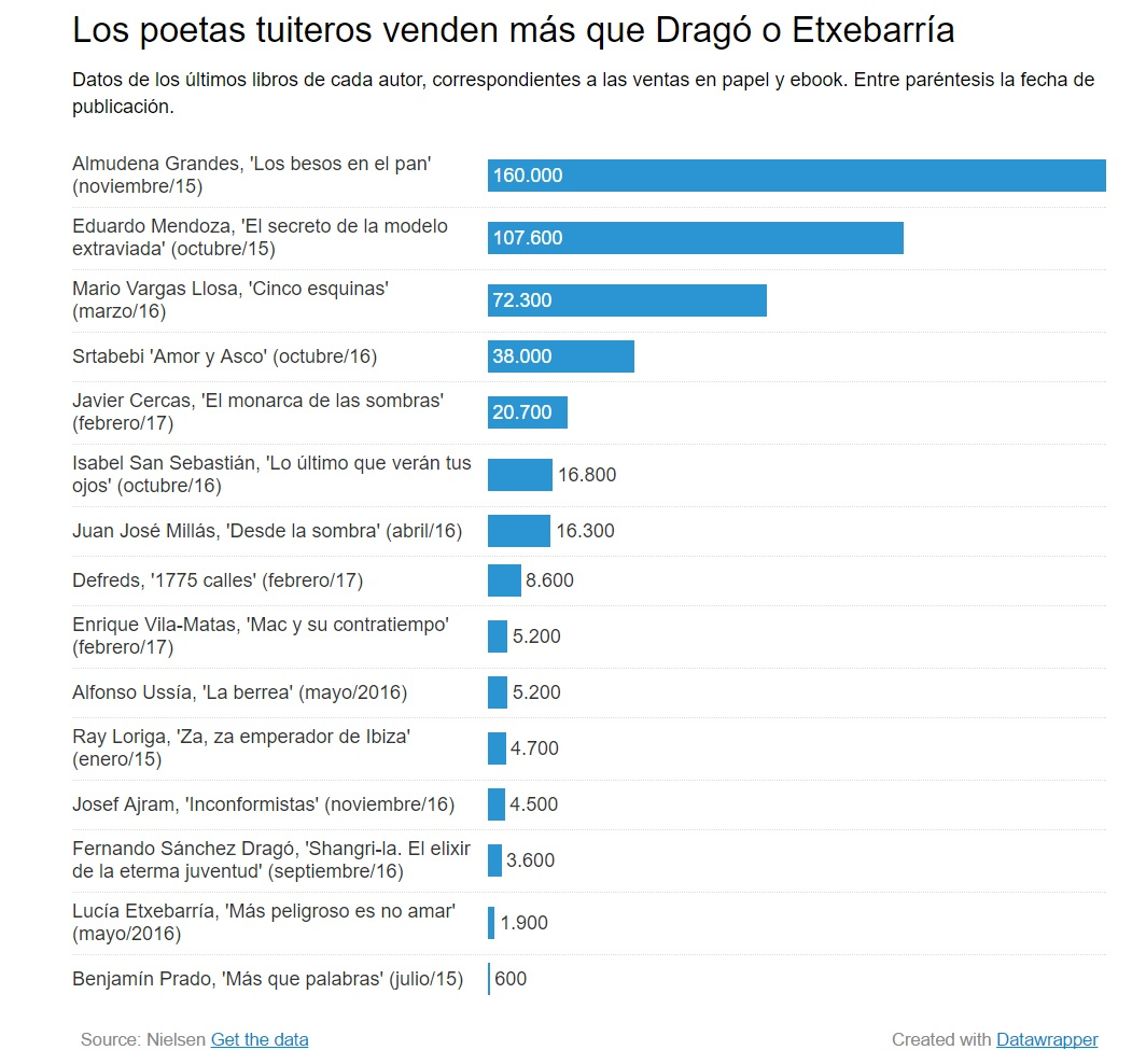 Y lo es porque en este país no venden libros los escritores, sino los nuevos famosos. Lo contaban hoy en un artículo fantástico en El Confidencial en el que se publicaban las cifras de venta de autores reputados en sus últimas obras. Salvo excepciones honrosas (y sin mención a súper escritores como mi admirado Pérez-Reverte) esos autores que uno ve en la Fnac o en la Casa del Libro venden apenas unos cientos de ejemplares.
