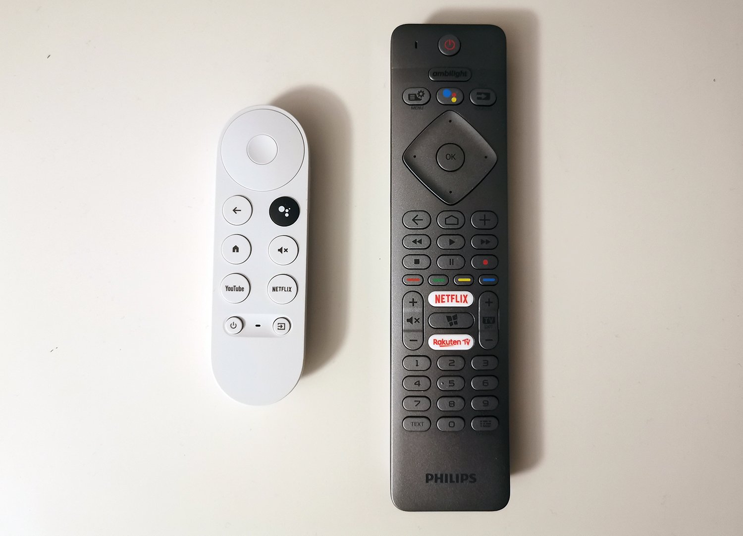 Por entonces ya me había comprado mi primer Chromecast con Google TV (4K), y tenía claro que quería aprovecharlo en esa tele para, entre otras cosas, disfrutar de su fluidez —claramente mejor que la del sistema de la tele— y sobre todo de su mando, que me parece un prodigio de minimalismo y simplicidad. Ya puse la foto con los mandos en aquel momento:
